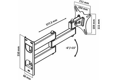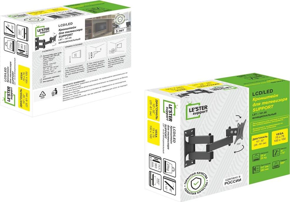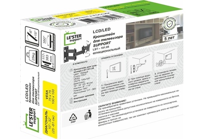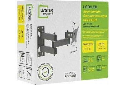 Наклонный-поворотный (Функц) Диагональ: 10"-32" (25-81см) Расстояние от стены: 117-383 мм Угол наклона: -6°/+15° Угол поворота: 350° Нагрузка: 25 кг Толщина металла адаптера 1,5 мм, основания 2 мм. Регулировка угла наклона и поворота без использования инструмента. Vesa 100*100.