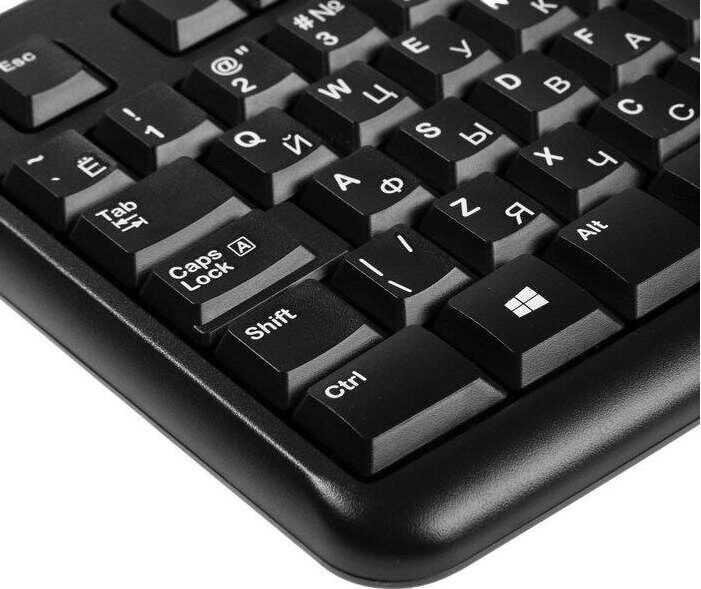 Интерфейс подключения: USB. Тип соединения клавиатуры: проводной. Питание клавиатуры от: по шине. Тип мыши: оптическая. Разрешение сенсора максимальное: 1000. Количество кнопок мыши: 2. Питание мыши: по шине. Длина провода клавиатуры: 1.5. Длина провода мыши: 1.8. Дизайн клавиш: квадратные. Цвет английских букв: белый. Цвет русских букв: белый. Защита от попадания жидкостей: есть. Особенности клавиатуры: Нанесена русская раскладка. Поддержка разрешений: 1000. Дизайн мыши: для правой и левой руки. Цвет клавиш клавиатуры: черный. Комплект поставки: Клавиатура, мышь, руководство. Габариты упаковки (ед) ДхШхВ: 0.52x0.16x0.05. Вес упаковки (ед): 1.18. Клавиатура с русскими буквами: с русскими буквами. Нанесение кириллицы: гравировка. Гарантия: 12 мес.. Цвет корпуса клавиатуры: черный. Цвет мыши: черный и серый. Размеры клавиатуры: 450 х 155 х 23.5 мм. Размеры мыши: 113 х 62 х 38 мм. Органы управления: колесо прокрутки, цифровой блок. Тип соединения: проводной, USB. Мышь: оптическая, 1000 dpi, количество кнопок 2.