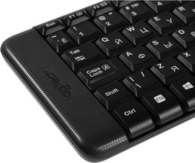 Набор беспроводной (клавиатура+мышь), интерфейс USB; клавиатура - классическая раскладка, мембранная, количество клавиш - 104, влагозащитная конструкция, тихий ход клавиш; мышь - оптическая, количество конопок - 3, разрешение - 1000 dpi, радиус действия - 10 м; комплект устойчив к механическим воздействиям.