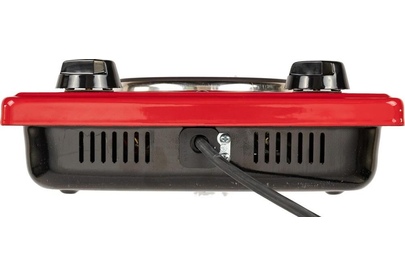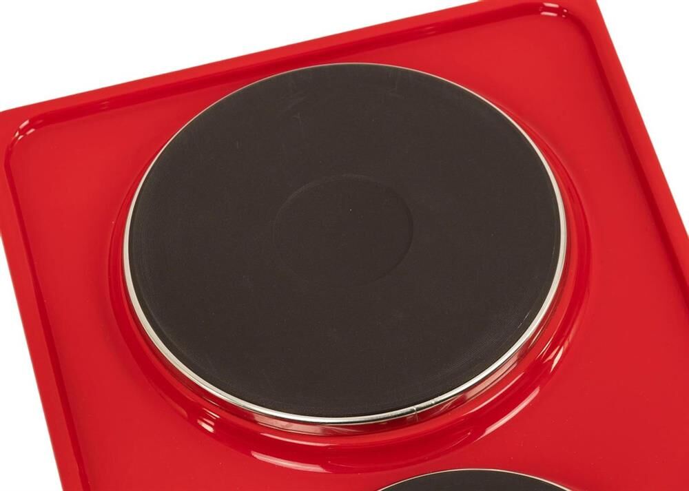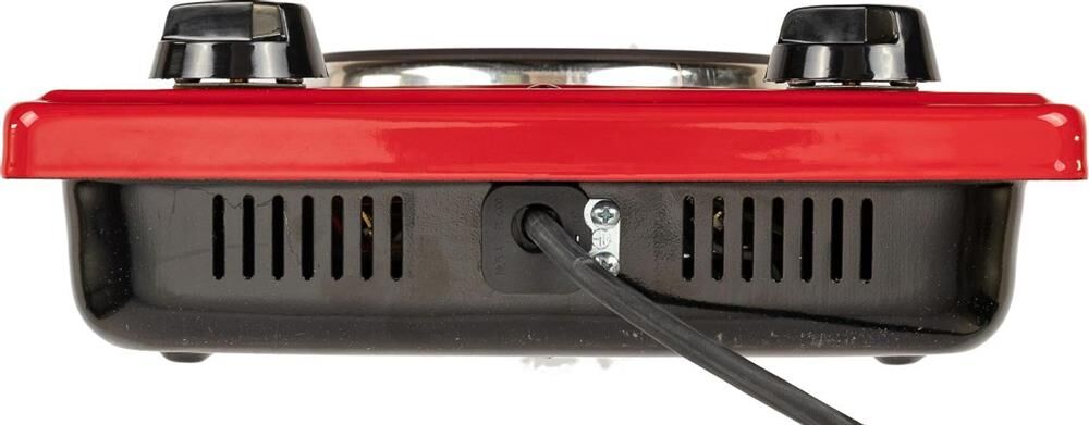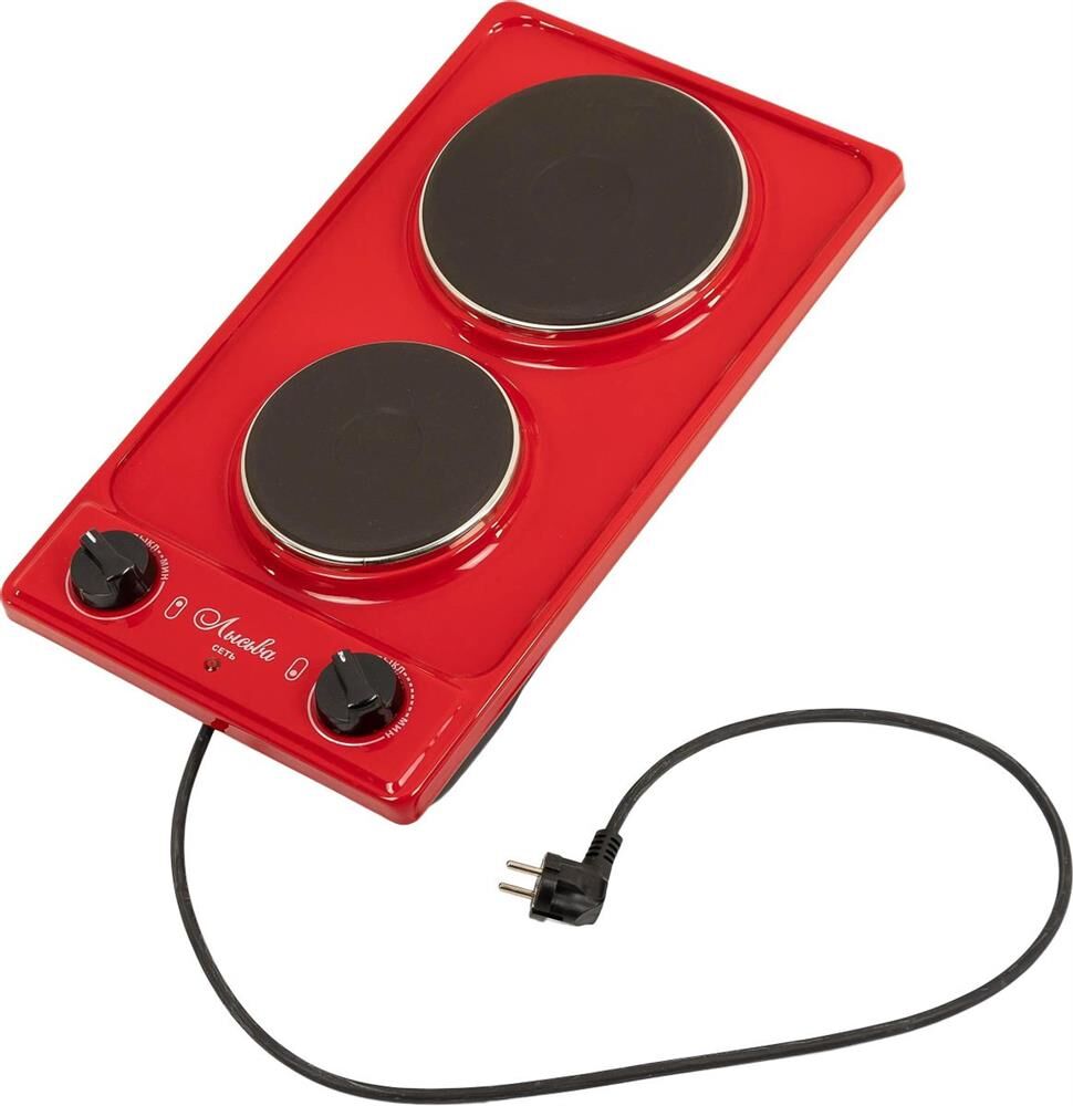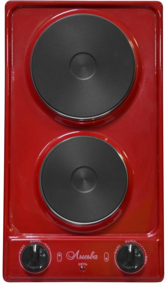 (ШхГхВ) 29х51х10см.Цвет вишневый.Установленная мощность: 2.2 кВт Масса нетто: 6 кг.Количество конфорок: 2 Мощность передней конфорки: 0.7 кВт (145 мм) Мощность задней конфорки: 1.5 кВт (180 мм) Бесступенчатая регулировка мощности.