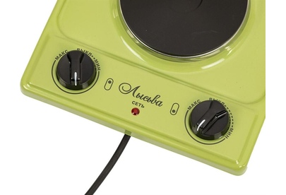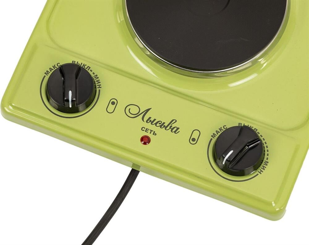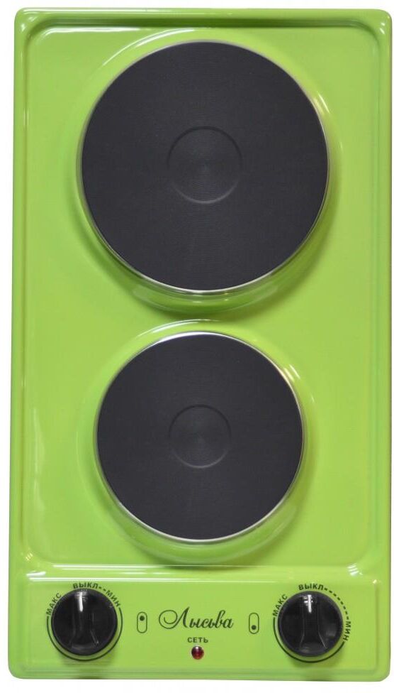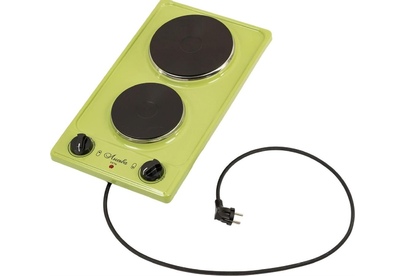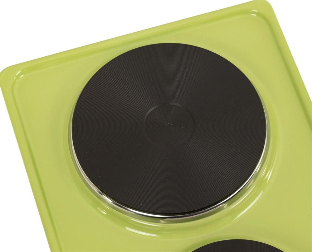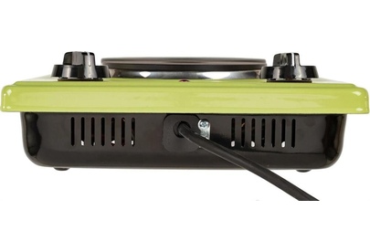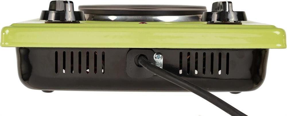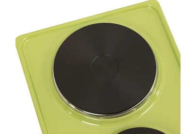 (ШхГхВ) 29х51х10 см.Цвет зеленое яблоко.Установленная мощность: 2.2 кВт Масса нетто: 6 кг.Количество конфорок: 2.Мощность передней конфорки: 0.7 кВт (145 мм).Мощность задней конфорки: 1.5 кВт (180 мм) Бесступенчатая регулировка мощности.
