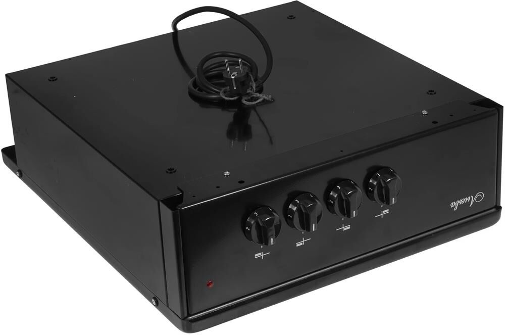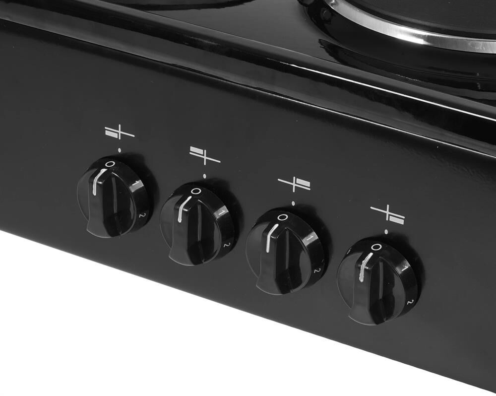 (ШхГхВ) 500х600х185/219 мм.Цвет черный.Установленная мощность: 3.8 кВт Масса нетто: 15 кг.Количество конфорок: 4.Мощность передней левой конфорки: 0.7 кВт (145 мм) Мощность передней правой конфорки: 1.2 кВт Мощность задней левой конфорки: 1.2 кВт Мощность задней правой конфорки: 0.7 кВт (145 мм)
