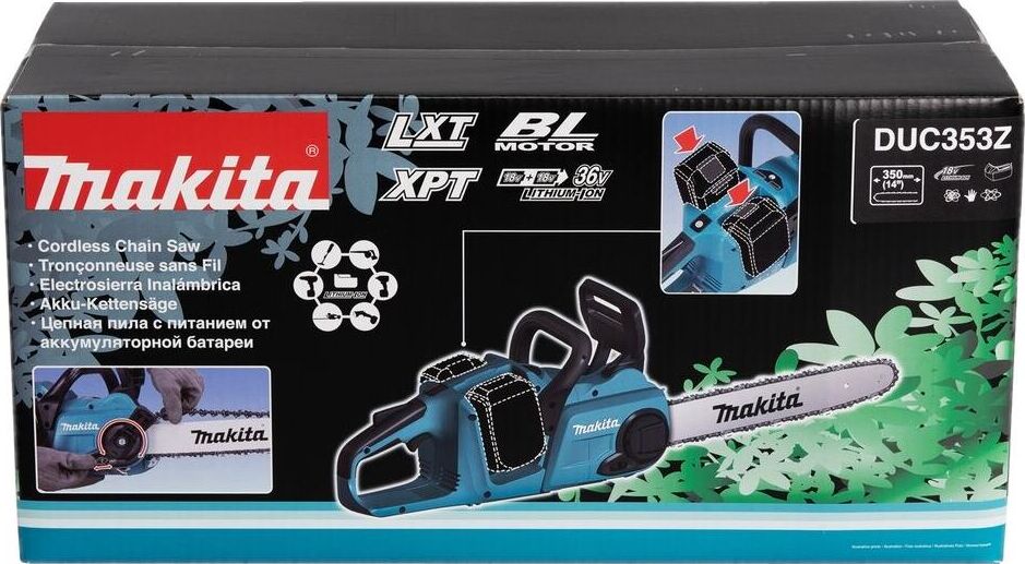 Тип: Цепная пила. Длина пильной шины: 14" (35 см). Скорость движения цепи: 20. Электропитание: от аккумулятора. Тип аккумулятора: Li-Ion. Напряжение аккумулятора: 18. Автоматическая смазка цепи: есть. Натяжение цепи: без использования инструментов. Вес товара: 4.7. Бак смазки цепи, объем: 0.2. Тип двигателя: электрический. Особенности: Защита от перегрева и перегрузки, защита от случайного включения.. Шаг цепи: 3/8". Количество звеньев цепи: 52. Ширина паза цепи: 1.1 мм. Модель аккумулятора: Makita BL18xx. Комплектация: Пила, коробка, цепь, чехол для шины.. Аккумулятор в комплекте: отсутствует. Зарядное устройство в комплекте: отсутствует. Габариты упаковки (ед) ДхШхВ: 0.53x0.221x0.25. Вес упаковки (ед): 6.3. Гарантия: 12 мес.. Длина шины: 14" (35 см). Вес: 4.7 кг. Аккумулятор: Li-Ion, 18 В. Двигатель: электрический. Цепь: шаг 3/8", ширина паза 1.1 мм, количество звеньев 52