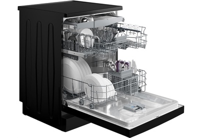 универсальный мотор, кнопочное управление, 5 программ, 15 комплектов, 3-я корзина, регулировка верхней корзины по высоте, конденсационная сушка, расход воды 9,9 л., уровень шума 44 дБ, частичная защита от протечек WaterSafe, автоматическое открывание дверцы, черный