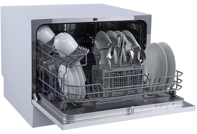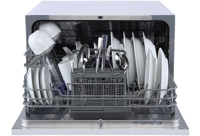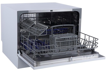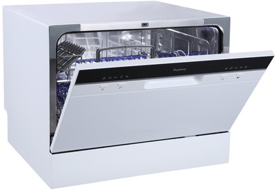 Компактная настольная посудомоечная машина расчитана на 6 комплектов. Отсрочка запуска 2/4/8ч. LED-индикация. Класс А+. 5 программ: интенсив, ECO, обычная, стекло, быстрая. Расход воды за цикл 6л. Энергопотребление за цикл 0,23 кВт*ч. Габариты ВхШхГ: 43,8x55x50 см.