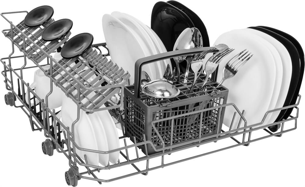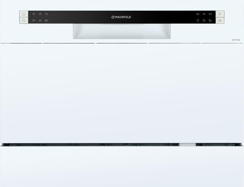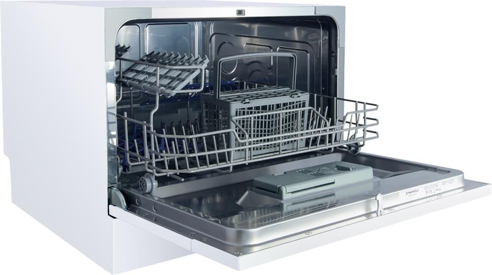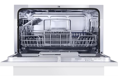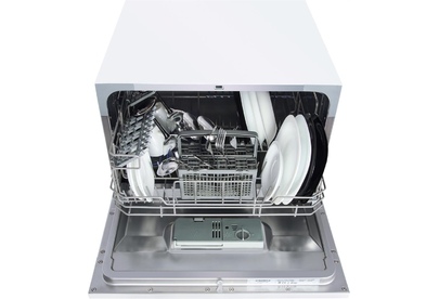 Компактная посудомоечная машина отдельностоящая. Количество комплектов 6. Сушка конденсационная. Габариты В/Ш/Г 43,8/55/50см. Цвет белый. Элементы управления кнопки. Дисплей LED. Количество программ 6. Количество температурных режимов 5. Отсрочка старта 2/4/6/8 часов. Количество корзин для посуды 1. Корзина для столовых приборов мобильная. Полка для чашек. Максимальный расход воды за цикл, 6,5л. Класс энергопотребления А+. Вес, 20,5кг.