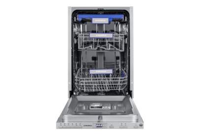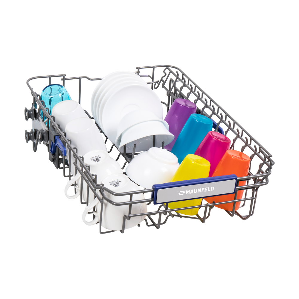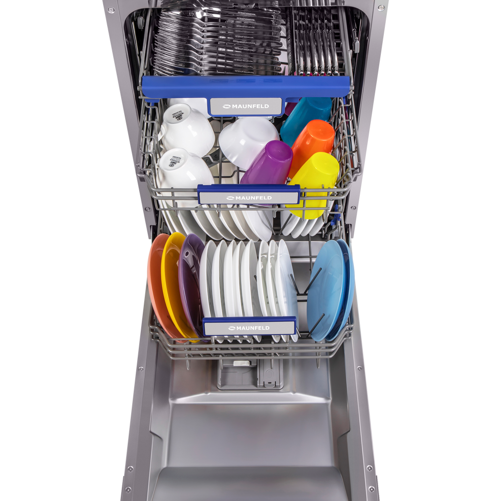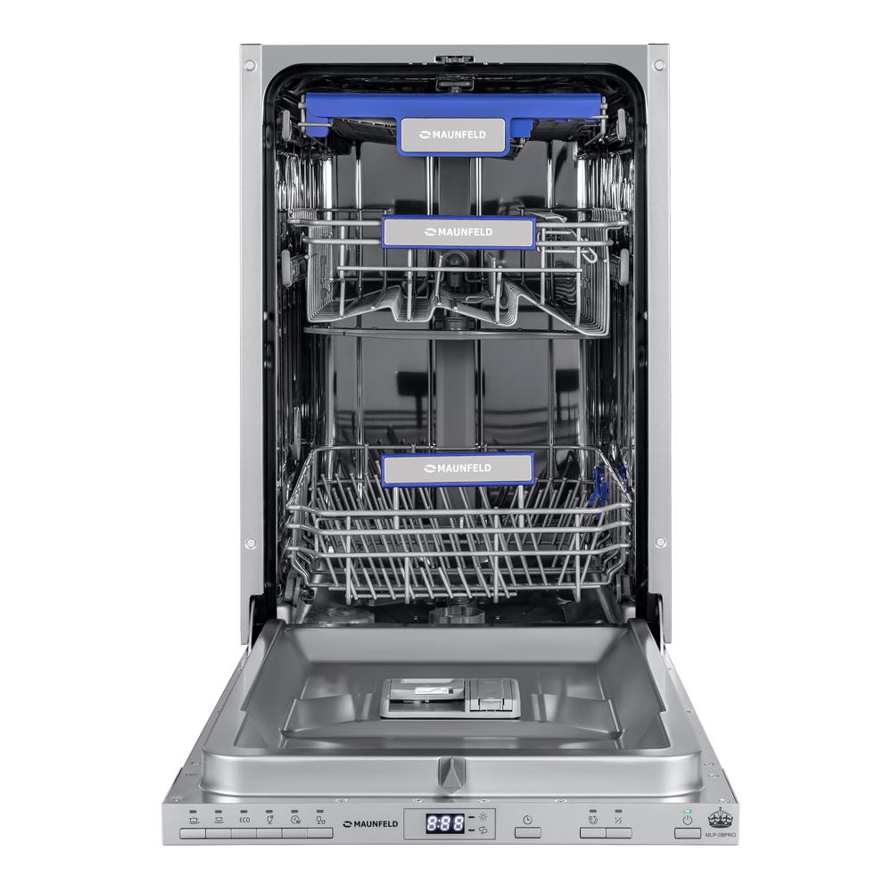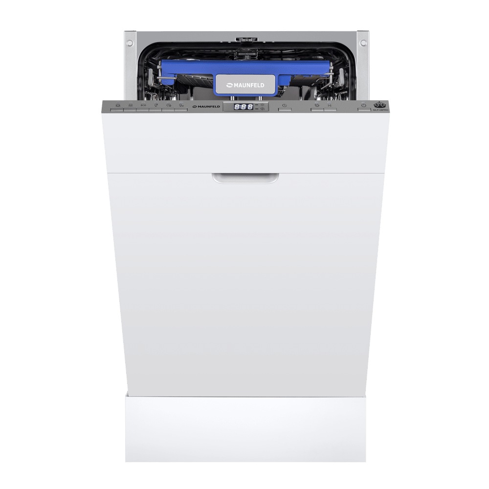 Посудомоечная машина Maunfeld MLP-08PRO станет незаменимой помощницей на любой кухне. Это полновстраиваемая узкая модель, т.е. она не будет занимать много места на любой кухне, независимо от ее размеров, в том числе на маленькой или средней. Она имеет следующие габариты: 81.5 сантиметр в высоту, 44.5 сантиметров — в ширину и 54 сантиметра — в глубину. Т.к. она встраиваемая, ее можно разместить под столешницей, тогда лишнее место вообще не будет занято. При этом вместительность составляет 10 комплектов посуды, конденсационная сушка. Устройство от Маунфилд имеет эффектный внешний вид: это стильный и современный дизайн, выполненный в черном и серебристом цветах, с использованием как матовых, так и глянцевых покрытий. Панель управления в черном цвете, яркий жидкокристаллический дисплей — это не только удобно и комфортно в процессе использования, но и смотрится привлекательно и красиво. Если в бытовой технике вы цените не только многофункциональность и технические возможности, но и внешний вид — эта м