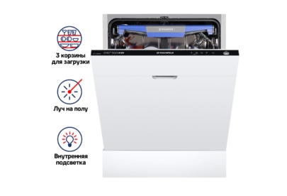 MLP-12IMROI — современная модель, выполненная в белом цвете. Загрузка посудомойки составляет 14 комплектов и подойдет для обслуживания большой семьи. Устройство оснащено тремя корзинами, средняя — регулируется по высоте. Прибор имеет инверторный двигатель, обеспечивающий долговечную работу и низкий уровень шума. Ключевые преимущества: Класс энергопотребления А+++ Инверторный двигатель Индикация луч на полу