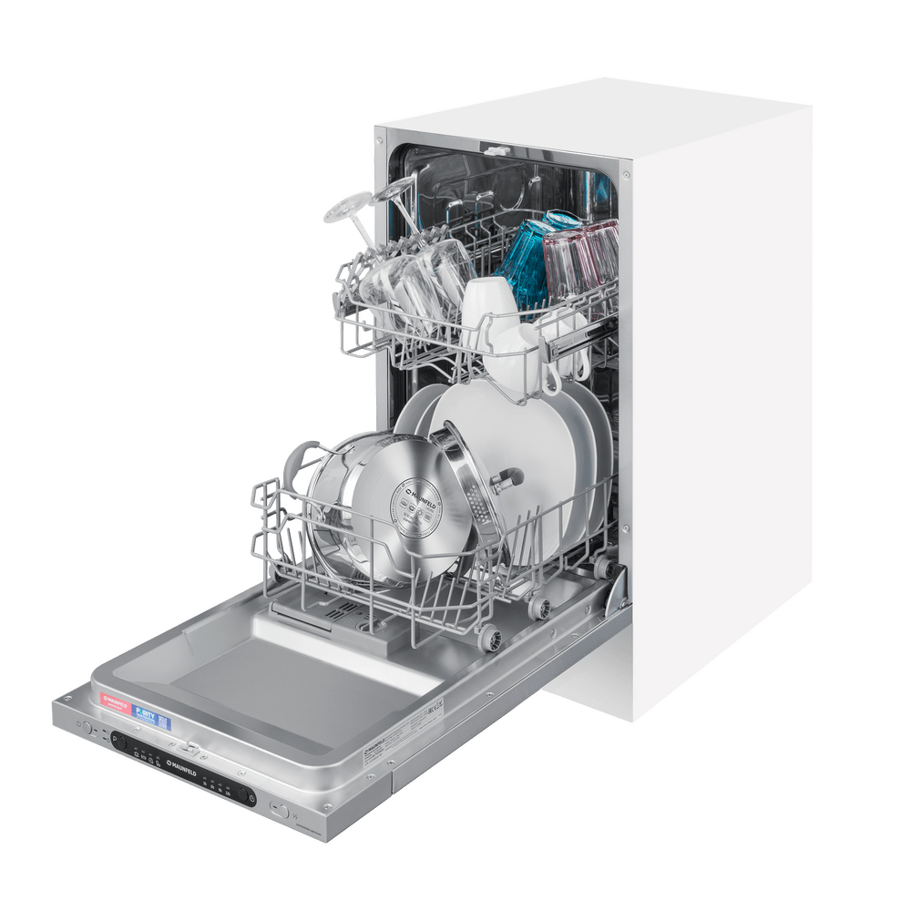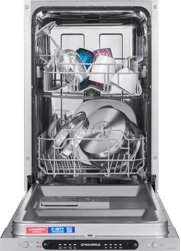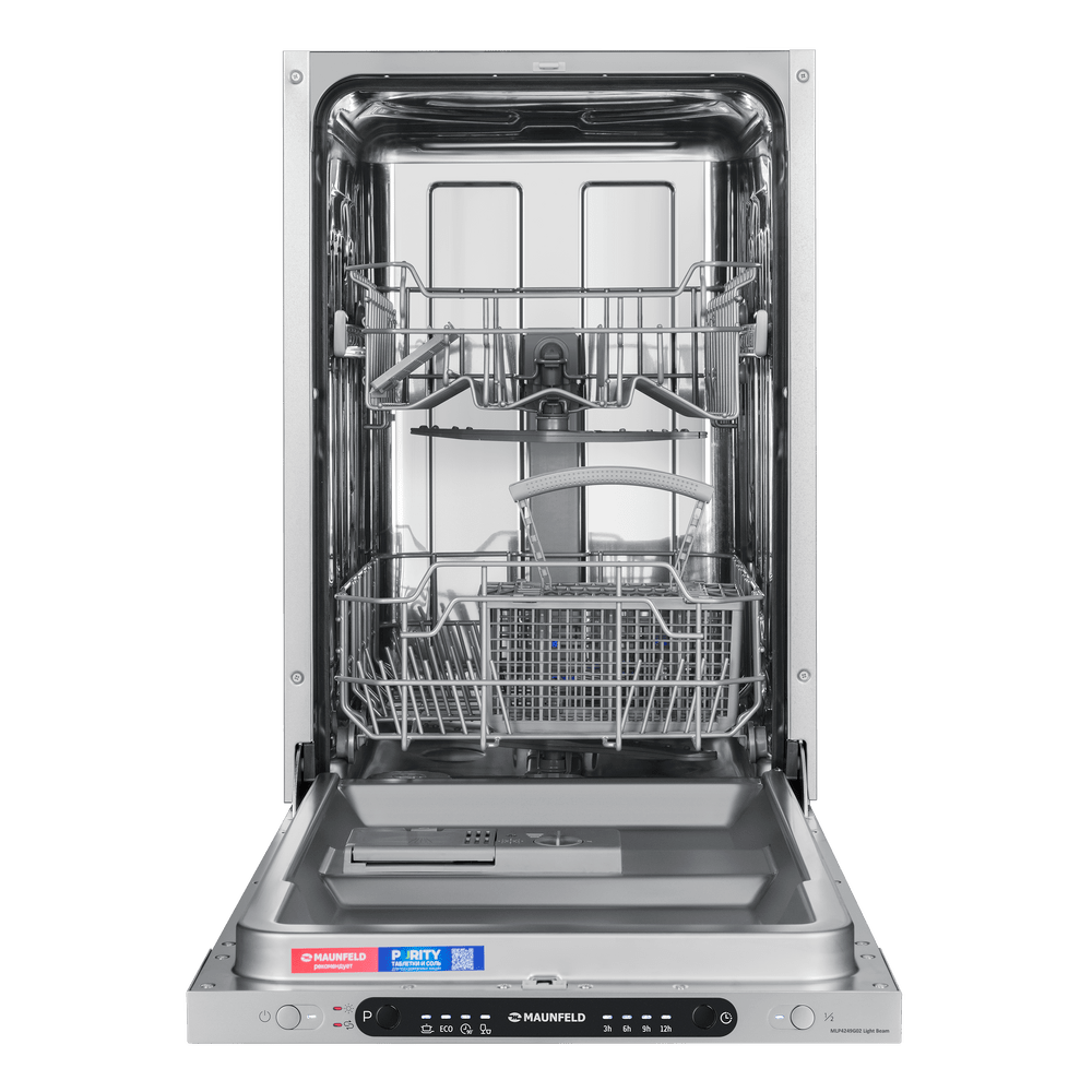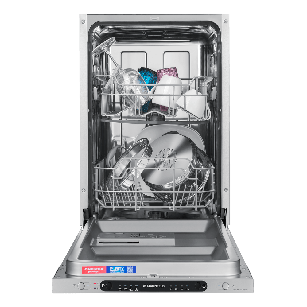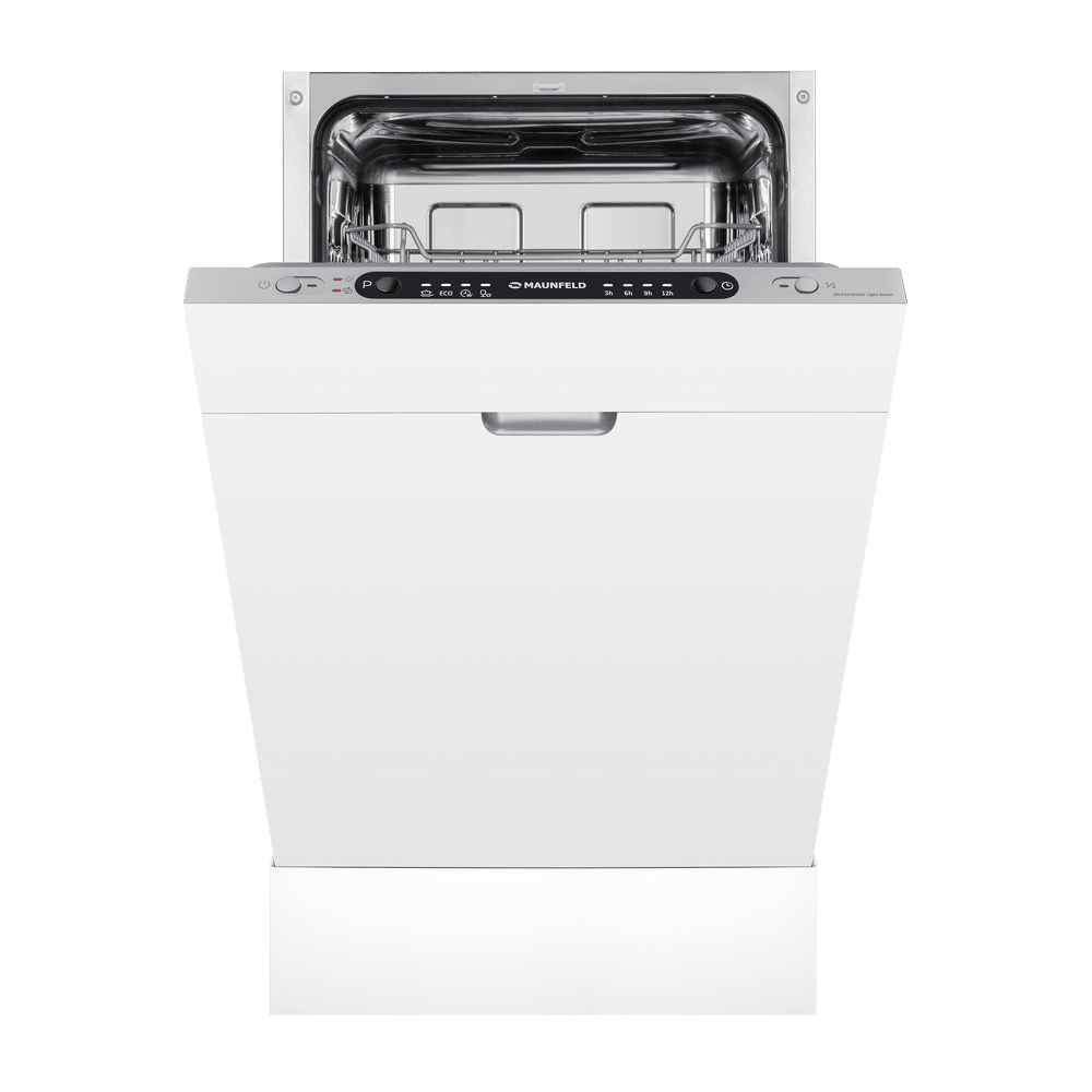 Встраиваемая посудомоечная машина Maunfeld MLP4249G02 Light Beam — это прекрасное решение для вашей кухни, которое сочетает в себе функциональность, элегантность и высокую эффективность. Изготовленная в Китае, эта модель имеет строгий и современный дизайн. Белый корпус машины и черная панель управления с кнопками создают стильный контраст, который будет гармонично смотреться в любом интерьере. Машина полностью встраивается в кухонный гарнитур, что позволяет сохранить единый стиль кухни и оптимизировать пространство. Габариты устройства (81.5×44.8×55 см) идеально подойдут для ниши размером 82×45×55 см. Несмотря на свои компактные размеры, машина способна помыть до 9 комплектов посуды за один цикл, что делает ее идеальной для средних и небольших семей. Maunfeld MLP4249G02 Light Beam оснащена 4 программами мойки и 4 температурными режимами, что позволяет выбрать наиболее подходящий режим в зависимости от степени загрязнения посуды и экономии энергии. Наличие функций половинной загрузки и использования средст