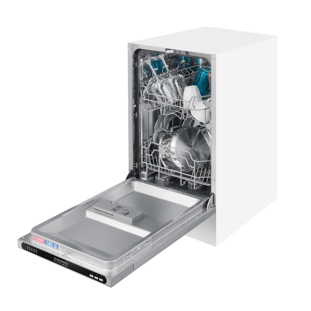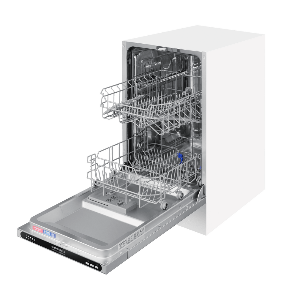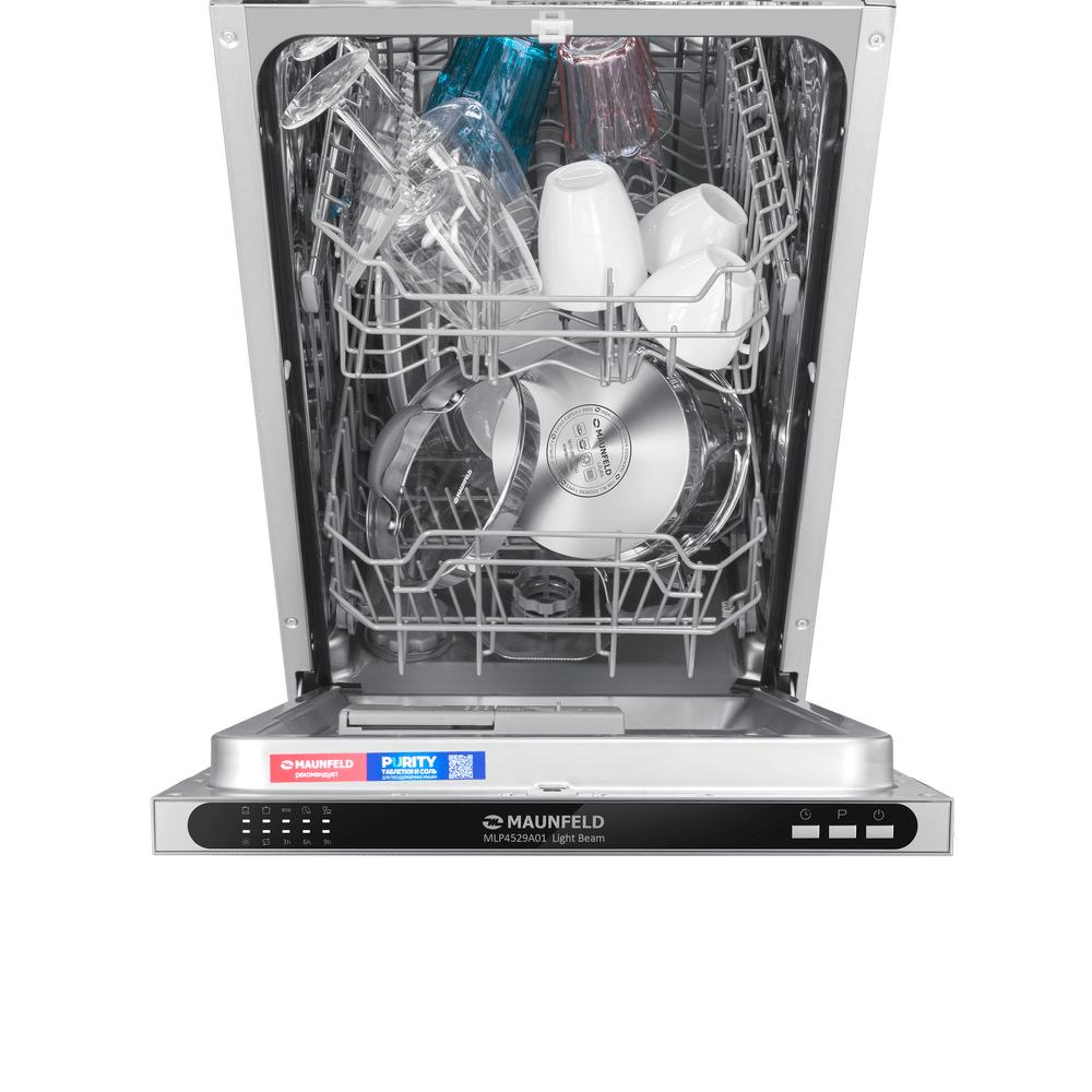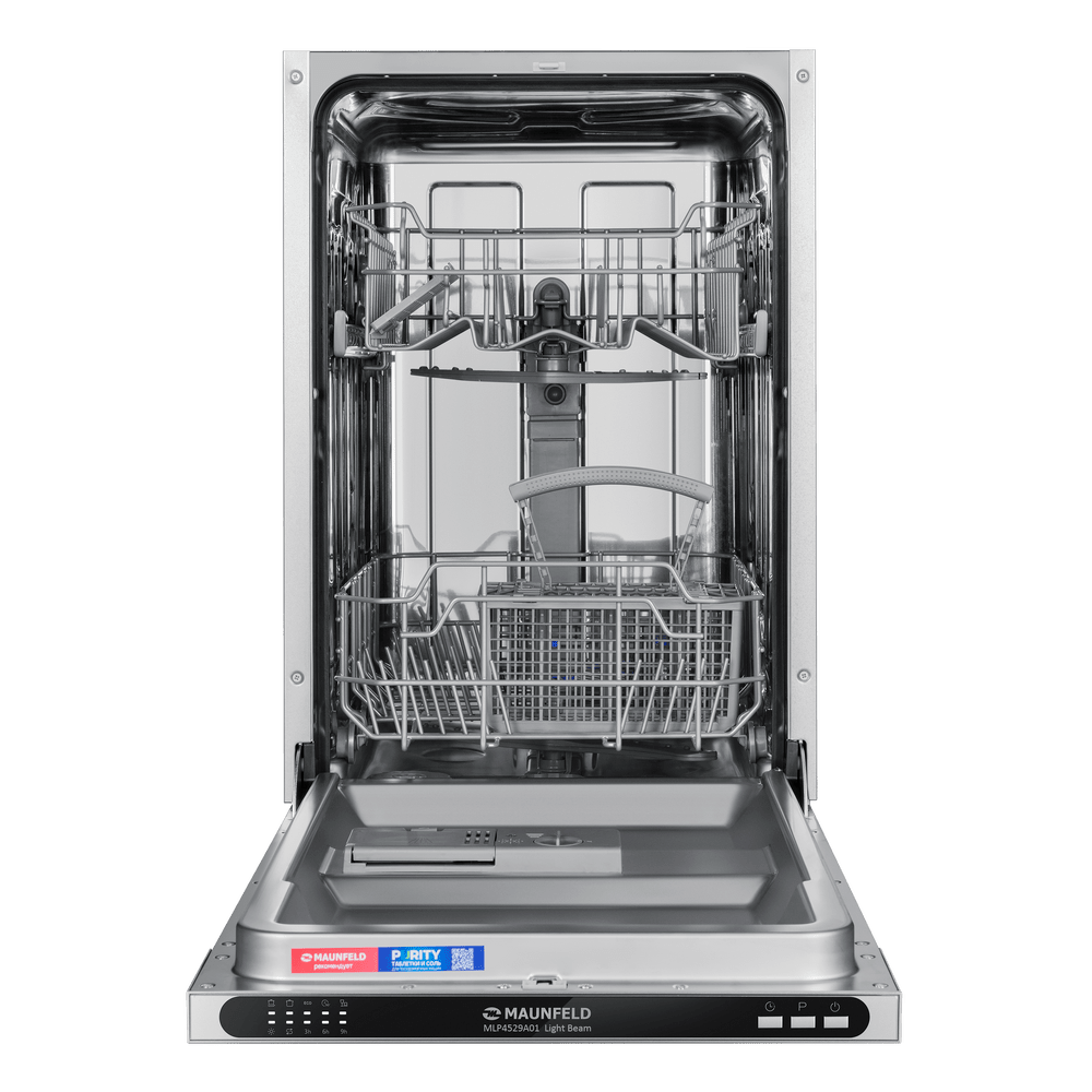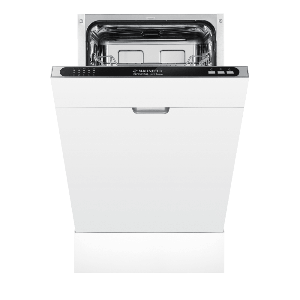 Встраиваемая посудомоечная машина Maunfeld MLP4529A01 Light Beam — это современное решение для тех, кто ценит комфорт и функциональность. Эта модель радует своих владельцев не только высокой эффективностью работы, но и стильным дизайном. Нержавеющая сталь, из которой выполнен корпус, и черная панель управления создают гармоничный и современный образ, который легко впишется в любой интерьер. Машина полностью встраивается в кухонный гарнитур, что позволяет сохранить единство стиля и максимально эффективно использовать пространство. Особенностью этой модели является ее компактность. Ширина всего 44.8 см позволяет установить машину даже на небольшой кухне, не теряя при этом в функциональности. Вместимость устройства — 9 комплектов посуды, что достаточно для обслуживания среднего семейства. Машина оснащена пятью программами мойки, позволяющими выбрать оптимальный режим в зависимости от степени загрязнения посуды и времени, которое вы готовы потратить на ее очистку. В арсенале программ есть стандартная, интенси