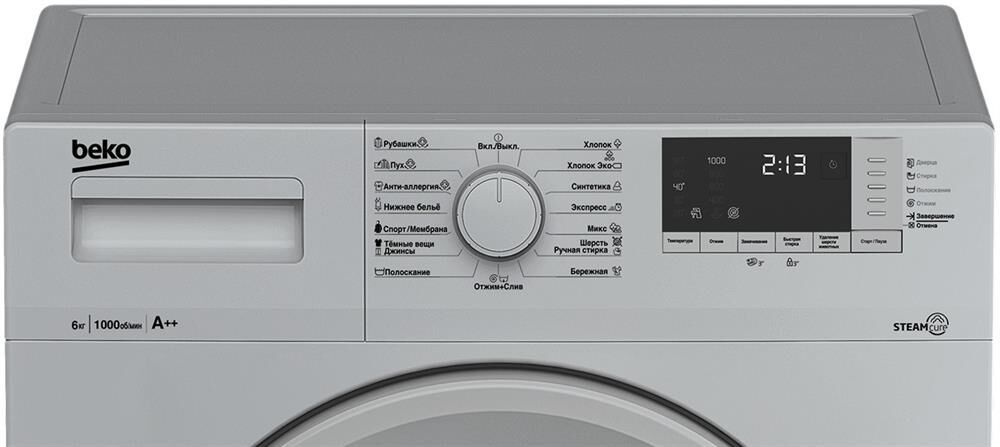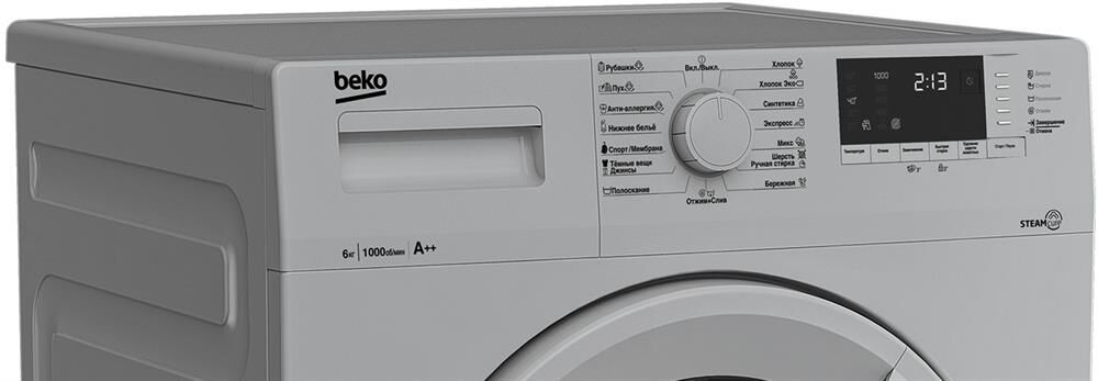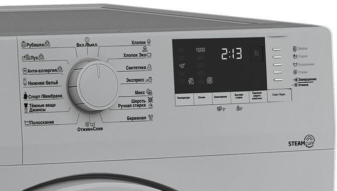 (ВхШхГ)84х60х41,5см. Цвет серебристый.Класс энергопотребления А. Максимальная загрузка 6 кг.Максимальная скорость отжима 1000 об/мин.Класс отжима C.Потребление электроэнергии 0.94 кВт.Расход воды 47.5 л.Уровень шума при стирке 61 дБ(А).Количество программ стирки 15.Дисплей Цифровой. Отложенный старт 0-19 ч.Обратный отсчет/Индикация времени до конца цикла. Электронный контроль дисбаланса.Технология обработки паром SteamCure. Нагревательный элемент Hi-Tech с защитой от накипи.Контроль пенообразования.