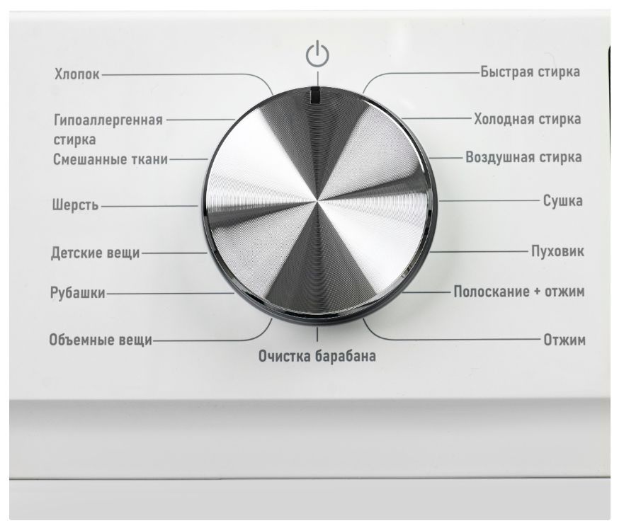 выбор скорости отжима, контроль баланса, очистка барабана, сигнал окончания стирки