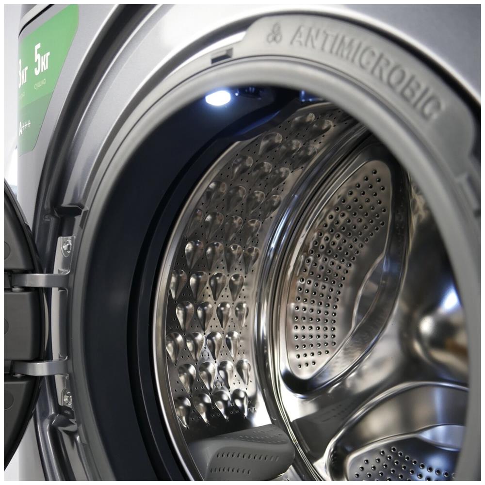 Макс. загрузка 8/5 кг (стирка/сушка) Макс. скорость отжима 1400 об/мин Объем барабана 54 л Класс А+++ Мощность 2000/1600 Вт (стирка/сушка) Кол-во режимов 17 Режимы Smart, Автоматическая балансировка белья, Без звука, Блокировка от детей, Обработка паром, Очистка барабана Управление Сенсорное Диаметр 480 мм (дверца) Вес нетто 60 кг Вес брутто 65 кг Уровень шума 62/69/76 дБ (стирка/сушка/отжим) Особенности Инверторная система, Подсветка внутренней камеры, Увеличенный объем камеры, Электронный регулятор устойчивости Габариты 60 х 43 х 84.7 см Класс защиты IPx4 Класс электробезопасности I Класс эффективности отжима А Потребление воды за цикл 48 л Энергопотребление за цикл 1,05/6,45 кВт/ч (стирка/стирка+сушка) Необходимое давление в водопроводе 0,03 – 1 МПа Функция "Сушка" Есть Функция "Пар" Есть Гарантия 3 года