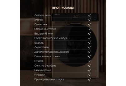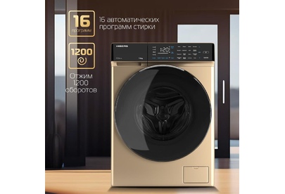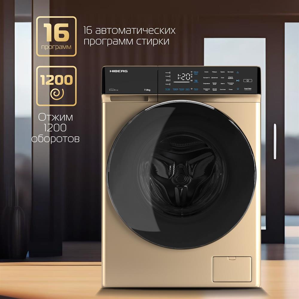 Мотор Direct Drive Inverter Motor А+++, 16 программ, Максимальная загрузка белья – 7 кг, Скорость отжима max 1200 об, Защита от протечек -полная (AQUA STOP) Объем бака – 41 л, Диаметр двери – 52 см, Ш*Г*В: 59,5*48*85, Материал барабана – нерж. Сталь, Материал Корпуса – Полипропилен, Система управления дисбалансом, Система обнаружения ошибок, Блокировка от детей Напряжение, частота 220-240В/50Гц Цвет - Золотистый
