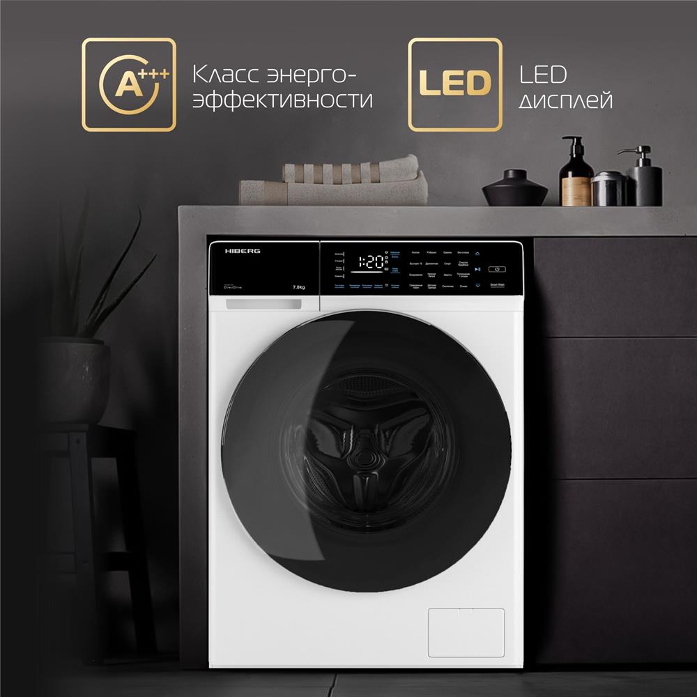 Максимальная загрузка белья (кг) 7; Максимальная скорость отжима (об/мин) 1 200; Класс энергопотребления A+++; Ширина (см) 59,5; Глубина (см) 51; Инверторный мотор,7 алгоритмов вращения,Интелектуальная стирка,SMART WASH Полностью сенсорное управление,10 лет гарантии на мотор