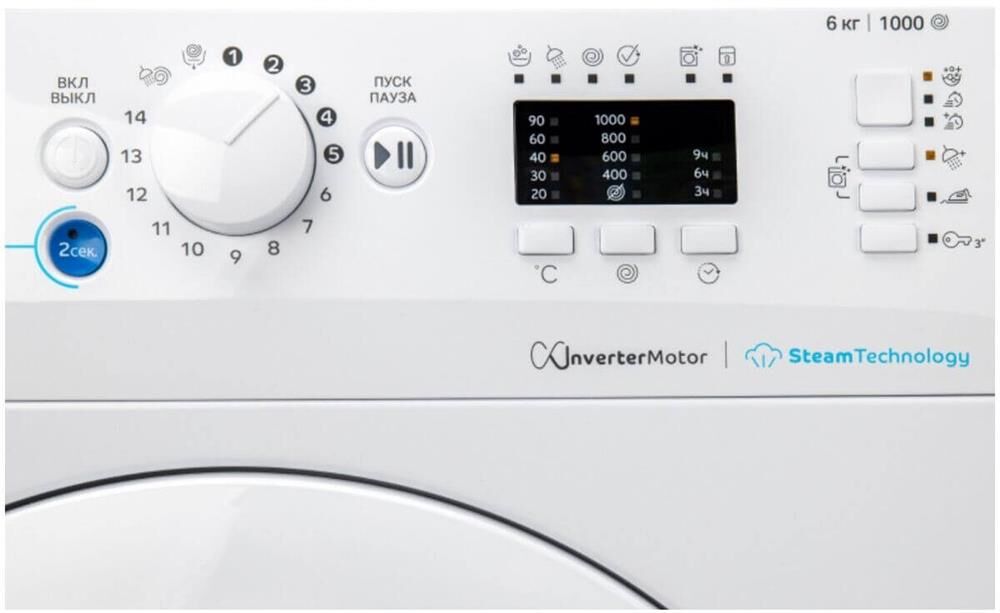 Загрузка: 6 кг, скорость отжима: 1000 об/мин, панель управления: LED+ дисплей, тип мотора: инверторный, сегмент: узкая стиральная машина, уровень шума при стирке/отжиме: 58/80 Дба, потребление воды за цикл: 52 л, потребление электроэнергии за цикл: 1,05 кВт/ч, кКол-во программ: 12, в том числе Хлопок, Синтетика, Цветные ткани, Деликатные ткани, Смешанное, Быстрая 30’, удаление запахов, функция: Push&Go Steam, функция: Отложенный запуск, функция: Выбор температуры, функция: Пятна, функция: Выбор скорости отжима, индикатор заблокированного люка, индикация стирки / полоскания / отжима / слива, защита от детей