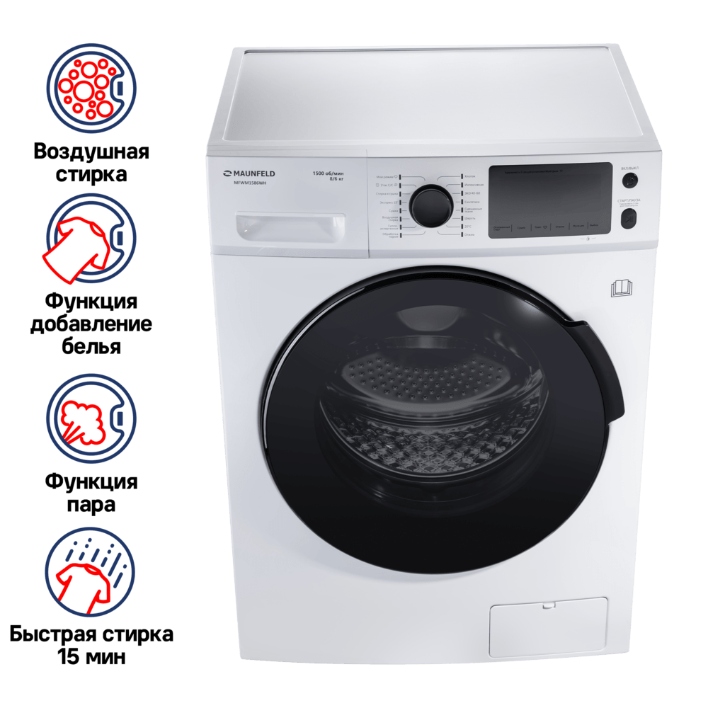 Стиральная машина Maunfeld MFWM1586WH – это отдельностоящая стирально-сушильная модель. Она выполнена в белом цвете, который, несомненно, подойдет к любому дизайну помещения. Техника обладает следующими габаритами: высота – 85 см, ширина – 59.5 см, глубина – 47.5 см. Несмотря на свои маленькие размеры, она предоставляет обширный функционал. Для управления и отображения информации в устройство встроен сенсорный дисплей, который загорается при включении и позволяет программировать работу девайса легкими и скользящими движениями. Также для настройки программ и функций используются кнопки, поворотные и сенсорные переключатели. Автоматическая балансировка барабана обеспечивает равномерное распределение вещей по его периметру для более эффективного отжима. Случайный избыток пены не проникнет в электронную панель управления, скачок электроэнергии не повредит двигатель. Система защиты от пены и перелива предотвратит проблемы с ремонтом прибора, что гарантирует качественную и безопасную эксплуатацию.