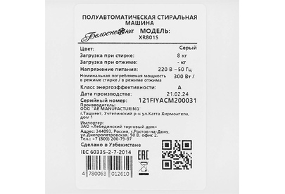 (ШхГхВ)52,4х44,5х84,5см.Цвет белый/серый.Загрузка белья для стирки и отжима, кг8.Тип двигателя стандартный.Установка отдельно стоящая.Класс энергопотребления A.Уровень шума при стирке, дБ 74.Количество программ 2. Программа стирки деликатных тканей.Тип управления механическое.Вес брутто, кг14.5.Страна-производительУЗБЕКИСТАН.