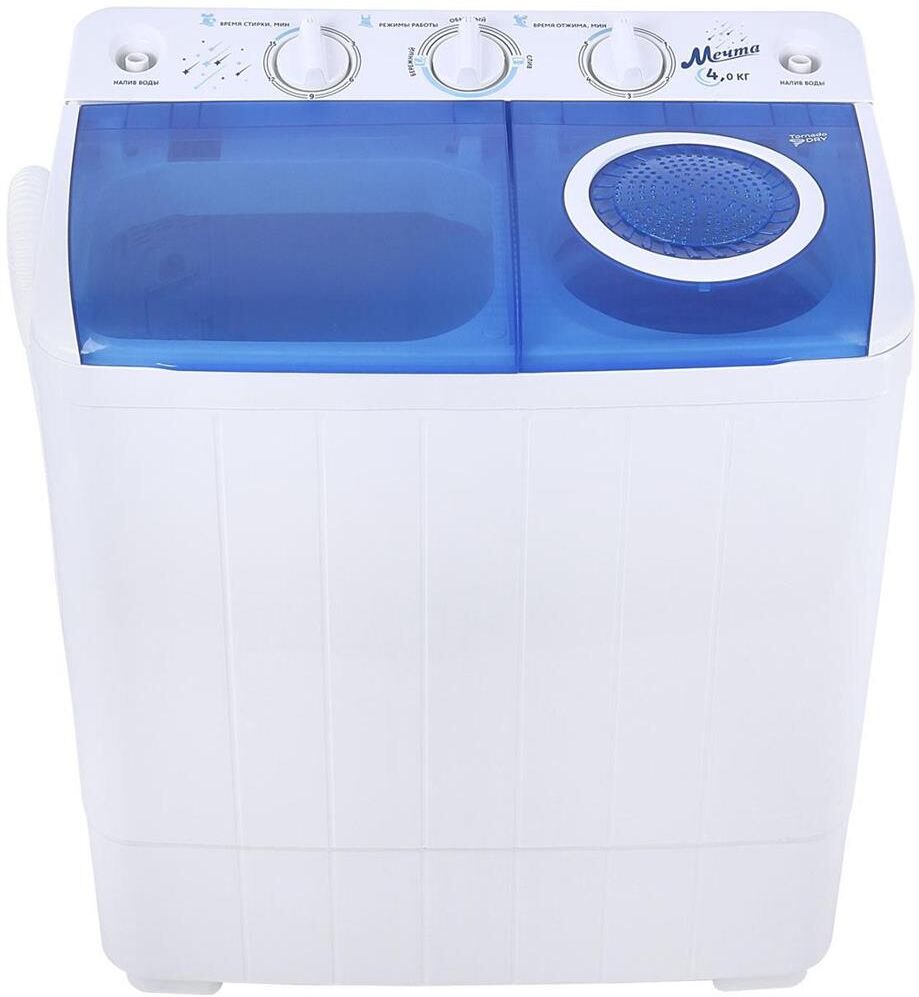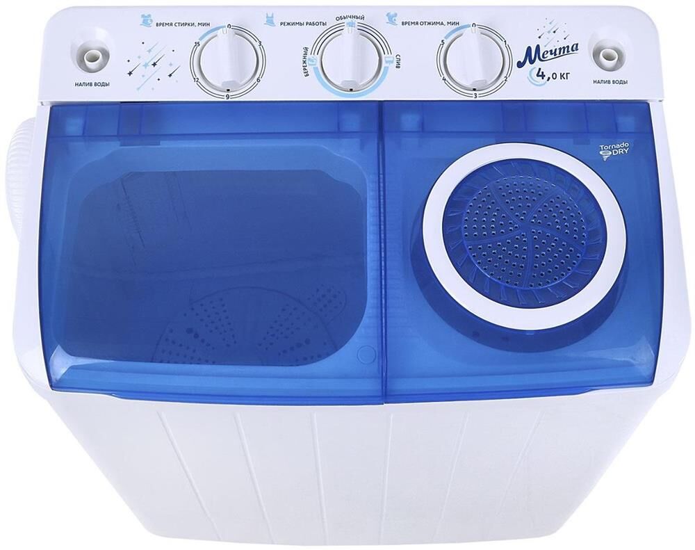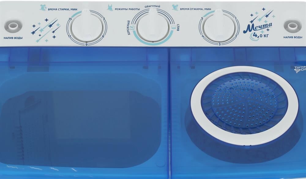 Система TornadoDry (воздушная сушка белья)! Загрузка для стирки 4кг; загрузка для отжима 2кг; помпа; мощность мотора (стирка/отжим) 250/130Вт; отжим 1350 об/мин; таймер стирки до 15 мин; таймер отжим до 5 мин; габариты изделия 600х380х630 мм; вес 10,75 кг