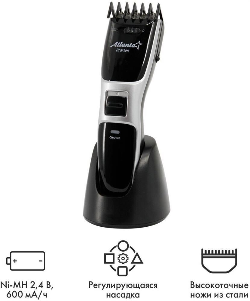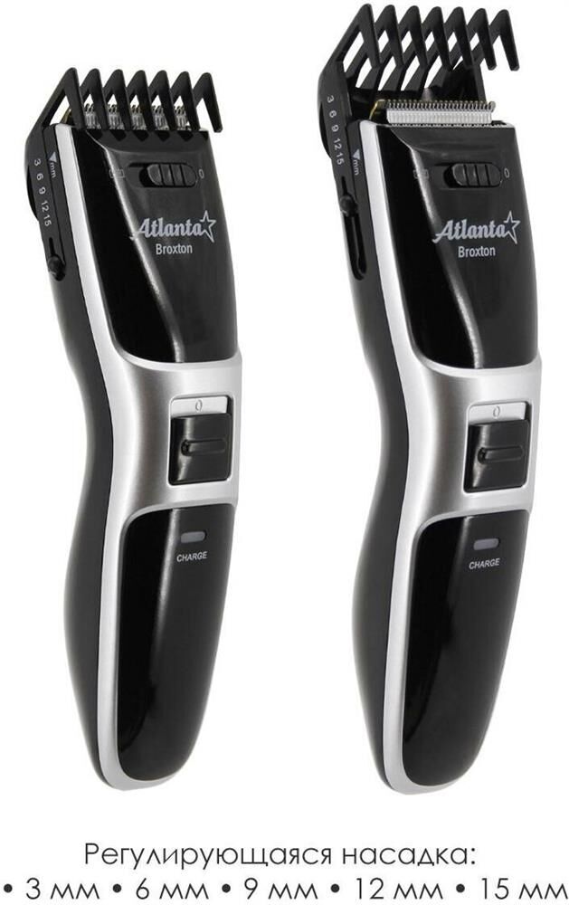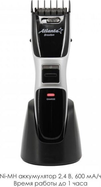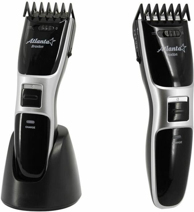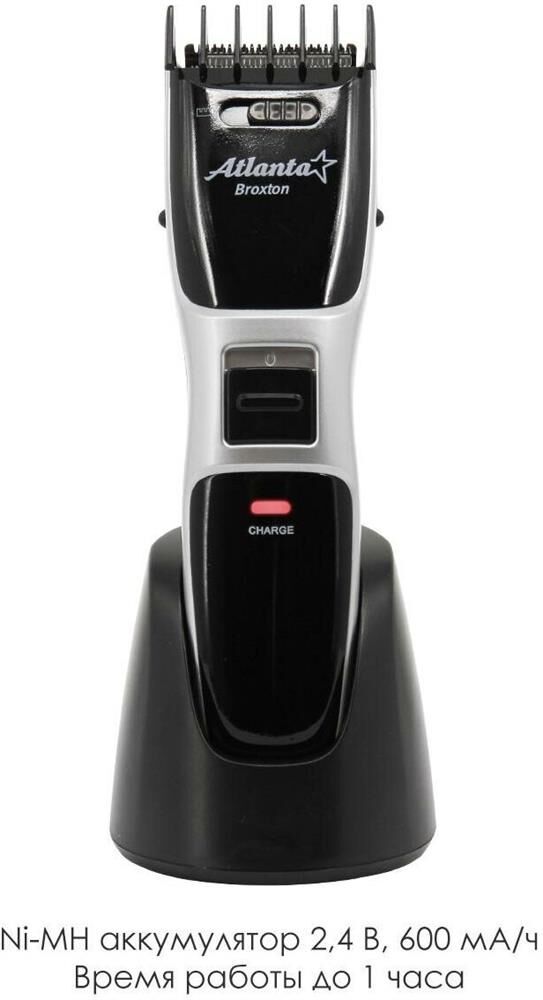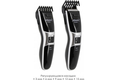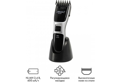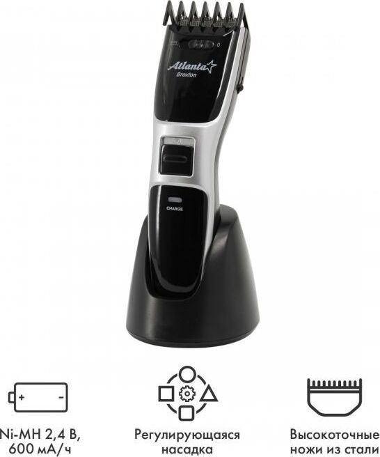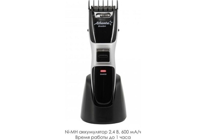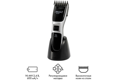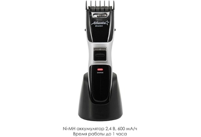 ATLANTA ATH-6902 (SILVER) Удобная подставка с зарядкой Питание от аккумулятора и через адаптер Регулируемая насадка: 3, 6, 9, 12,15 мм Функция филировки Дополнительные аксессуары в комплекте Индикатор зарядки Прецизионные ножи из стали высокой прочности Долговечный, мощный аккумулятор Ni-MH 2,4 В; 1200 мА/ч
