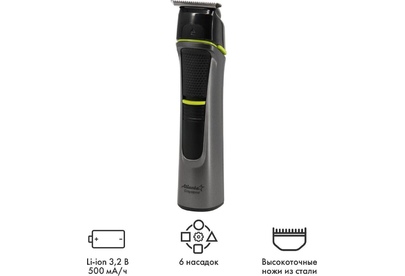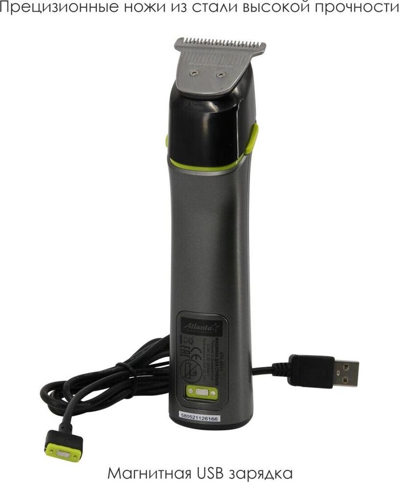 ATLANTA ATH-6914 (GRAY)\ Li-ion аккумулятор 3,2 В; 500 мА/ч, 6 насадок, степень защиты IPX5 УДОБСТВО Для вашего удобства в машинке для стрижки установлены мощные долговечные аккумуляторы. В сочетании с подставкой для зарядки машинка оставляет впечатление энергонезависимой. НОЖИ Высокоточные ножи, выполненные из специального нержавеющего закаленного сплава, превосходно стригут волосы. Почистить и смазать ножи теперь не проблема, благодаря модульной конструкции стригущего блока. САМ СЕБЕ СТИЛИСТ Даже начинающий пользовать может сделать стильную, а главное ровную прическу, благодаря удобной насадки и функции филирования. Насадка позволяет выбрать необходимую длину волос и не дает снимать лишнее.