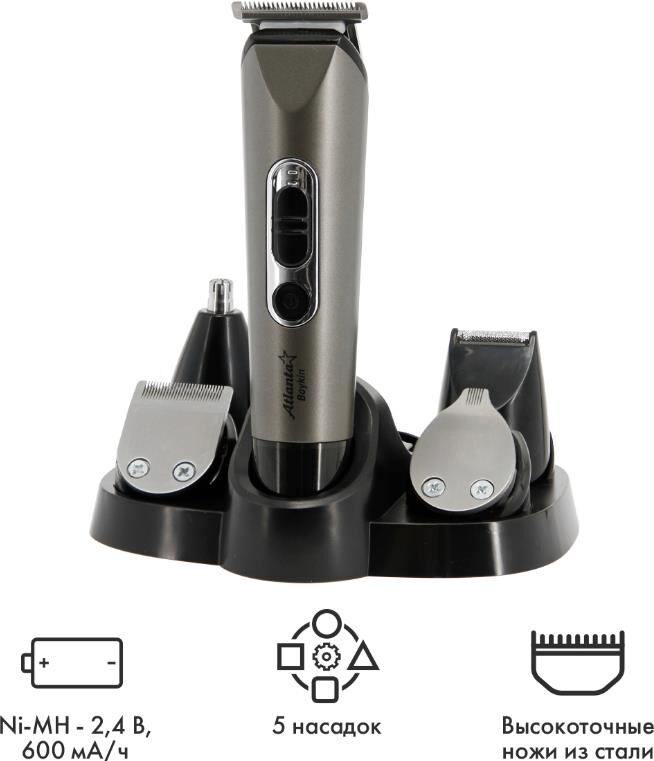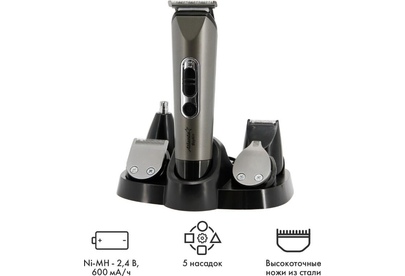 Питание от аккумулятора и от кабеля (1.9 м) Зарядный кабель в комплекте Подставка для всего набора Полноразмерный триммер для стрижки Две насадки для стрижки волос Сверхточный триммер с насадкой для бороды Гигиенический триммер Насадка бритва Все насадки можно промывать в воде Индикатор зарядки Долговечная Ni-MH батарея 2,4 В 600 мА/ч Мощность 9 Вт