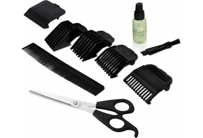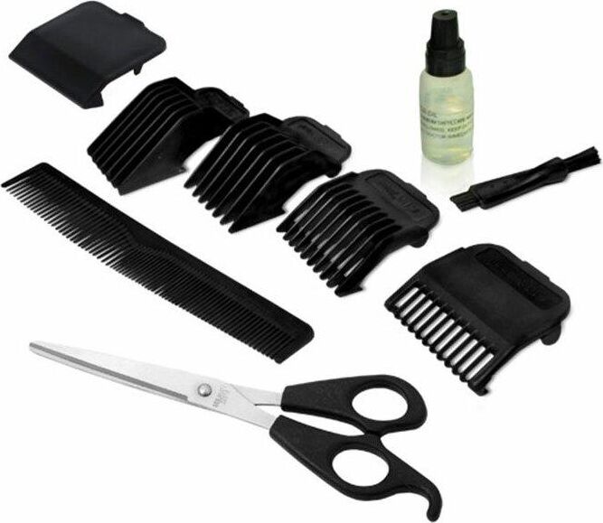 защитная крышка, щетка, документация, ножницы, масло, расческа, 4 насадки (3-6-9-12 мм).