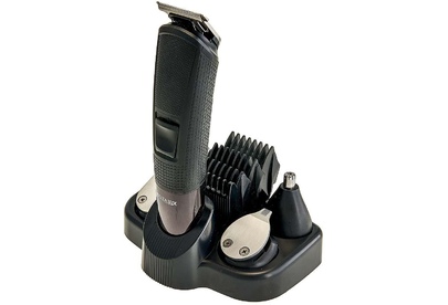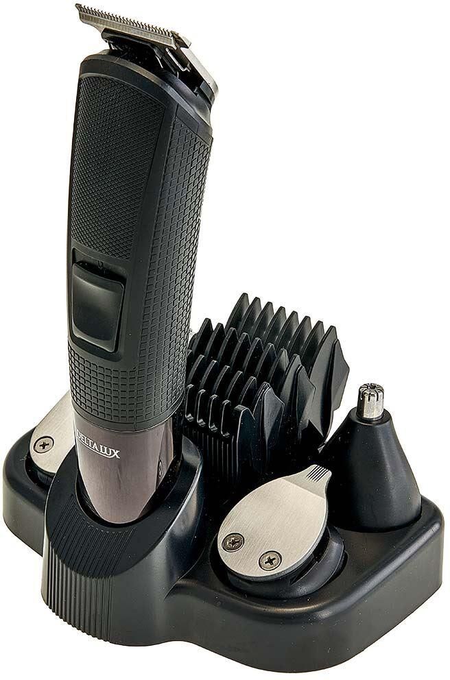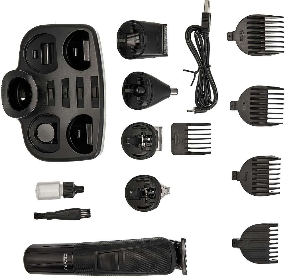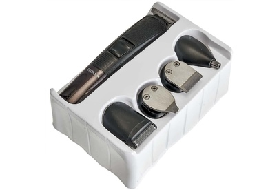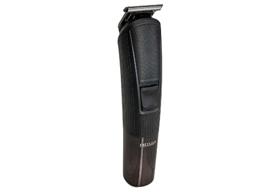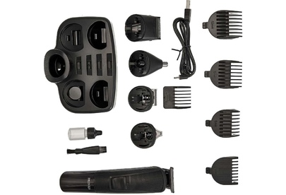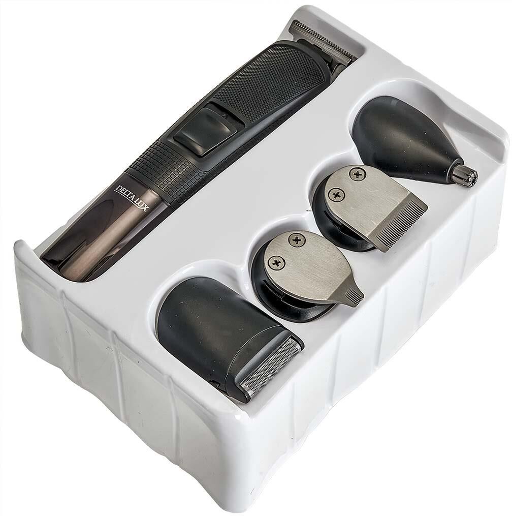 Набор для стрижки и бритья 5 в 1. Потребляемая мощность 5 Вт, Время непрерывной работы до 90 минут, Время заряда аккумуляторной батареи 90 минут, Температура эксплуатации от +5°С до +35°С, Лезвия из нержавеющей стали, LED-дисплей, 2 режима работы: от сети питания и от аккумулятора, Тип аккумуляторной батареи: 14500 Li-ion 3,7 В 600 мА-ч, 5 съемных насадок:насадка-бритва, насадка для коррекции и дизайнерской стрижки, насадка для носа и ушей, насадка стандартный триммер, насадка узкий триммер для подравнивания. Щеточка для чистки лезвий, Подставка для хранения набора.