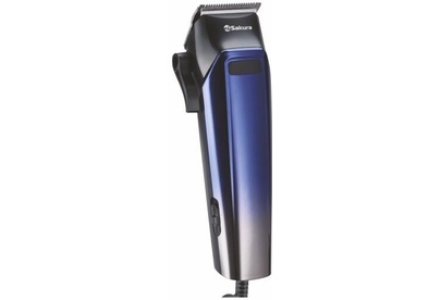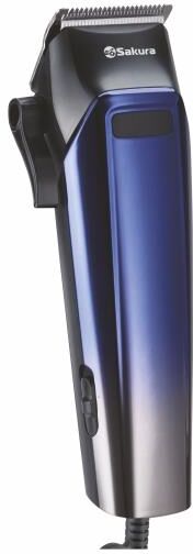 Стальные лезвия, работа от сети 220-240 В, мощный мотор (7 Вт), 3-ступенчатая регулировка лезвия с помощью рычажка, кабель питания 1,8 м, в комплекте: 4 насадки (3, 6, 9 и 12 мм), расческа, ножницы, масло, кисточка для очистки. Цвет: синий/ черный