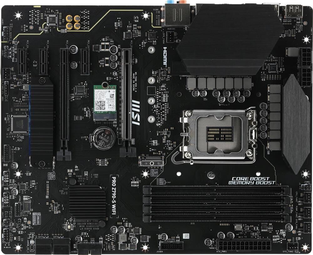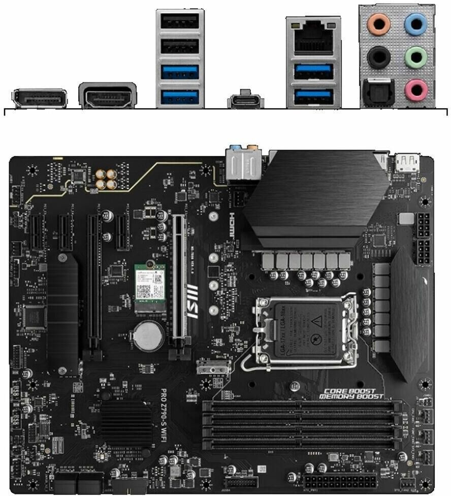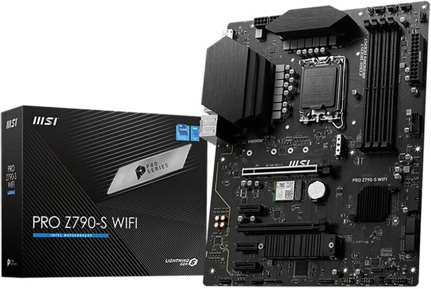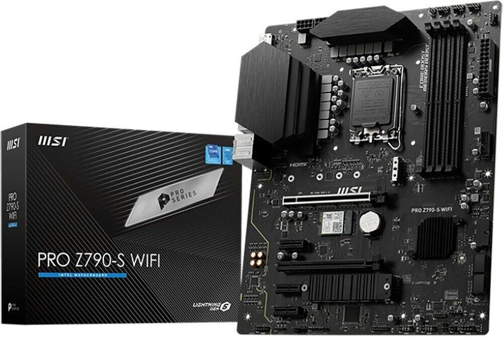 Материнская плата MSI PRO Z790-S WIFI предназначена для процессоров с разъёмом LGA1700 и чипсетом Intel Z790. Она поддерживает оперативную память DDR5 и имеет четыре слота для неё. Плата выполнена в форм-факторе ATX и оснащена интерфейсами HDMI и DisplayPort для подключения мониторов. Также имеется поддержка Wi-Fi и Bluetooth.