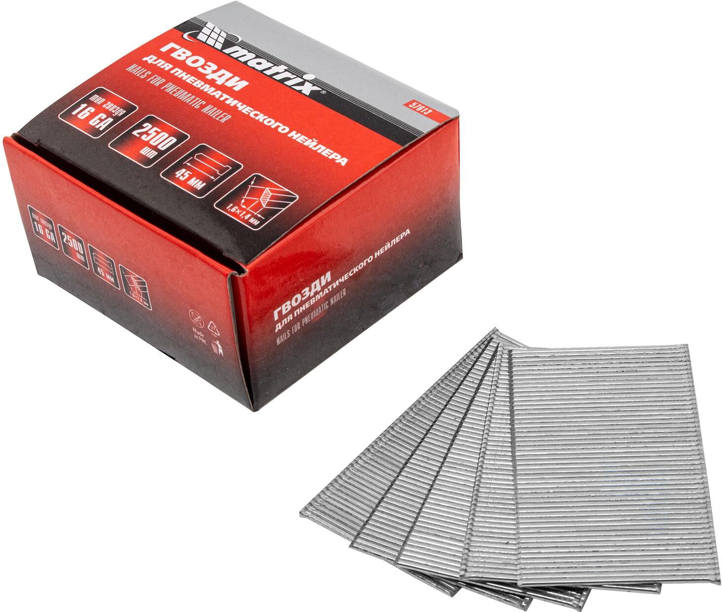 MATRIX Гвозди для пневматического нейлера 16GA, сечение 1.6 х 1.4, длина 45 мм, 2500 шт 57613