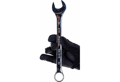 Комбинированный ключ Matrix 15171 размером 26 мм, из стали CrV, с покрытием «полированный хром», пригодится во время ремонтных работ дома или в гараже. С его помощью можно быстро монтировать и демонтировать крепежные элементы. Угол наклона кольцевого зева относительно плоскости инструмента составляет 15°, поэтому ключом удобно работать в труднодоступных местах.ПреимуществаВысокая деформационная стойкость — ключ изготовлен из хромованадиевой стали, а рабочая часть закалена до твердости 45 HRC.Защита от разрушения — полированное хромовое покрытие предотвращает образование коррозии.Аккуратная работа — накидные части с 12-гранным профилем охватывают всю поверхность крепежа, уменьшая риск деформации его граней.