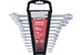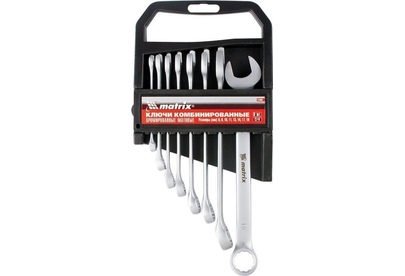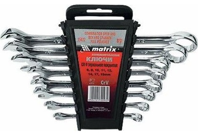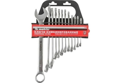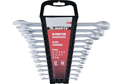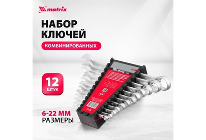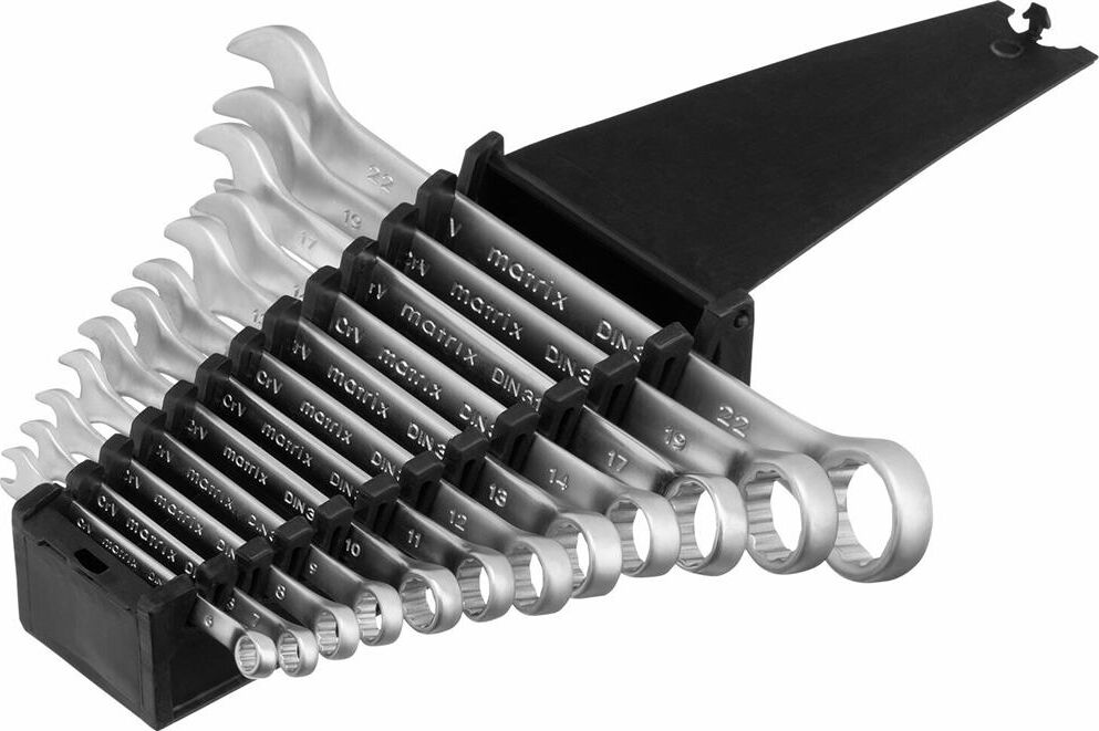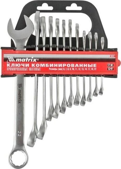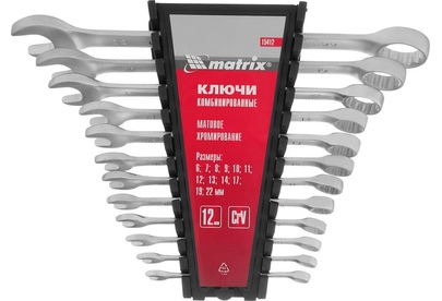 Набор Matrix 15412 включает 12 комбинированных ключей из стали CrV, размером 6-22 мм, с покрытием «матовый хром», которые пригодятся во время ремонтных работ дома или в гараже. С их помощью можно быстро монтировать и демонтировать крепежные элементы. В набор входят инструменты основных типоразмеров, позволяющие эффективно решать поставленные задачи.ПреимуществаВысокая деформационная стойкость — ключи изготовлены из хромованадиевой стали, а рабочие части закалены до твердости 45 HRC.Защита от разрушения — матовое хромоникелевое покрытие предотвращает образование коррозии.Аккуратная работа — накидные части с 12-гранным профилем охватывают всю поверхность крепежа, уменьшая риск деформации его граней.Комфортная работа в ограниченном пространстве — угол наклона кольцевых зевов относительно плоскости инструментов составляет 15°, что делает монтаж крепежа более удобным.Удобный пластиковый держатель — ключи не потеряются во время хранения и транспортировки.