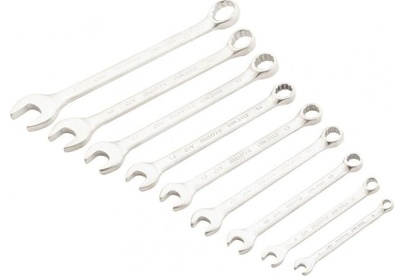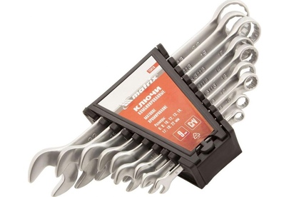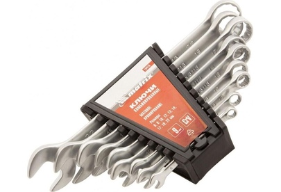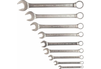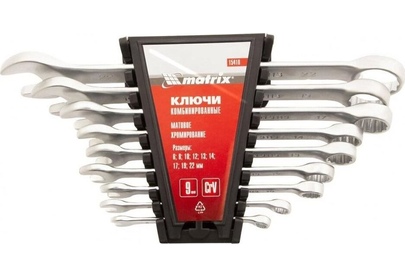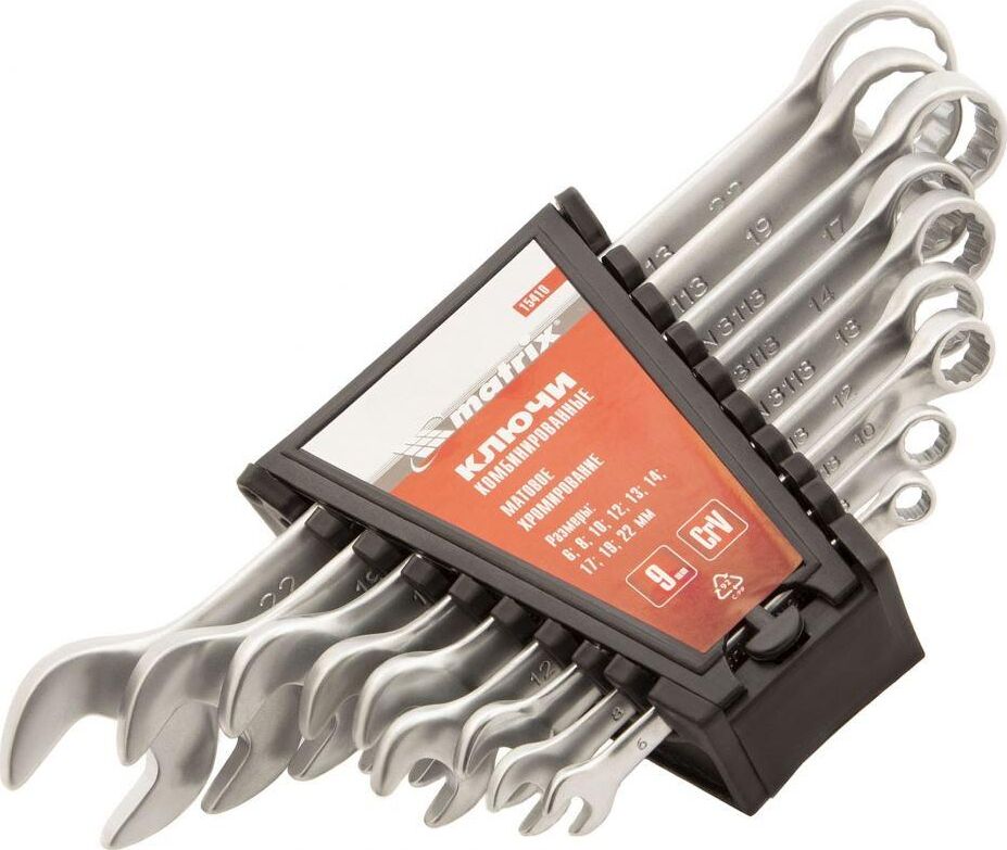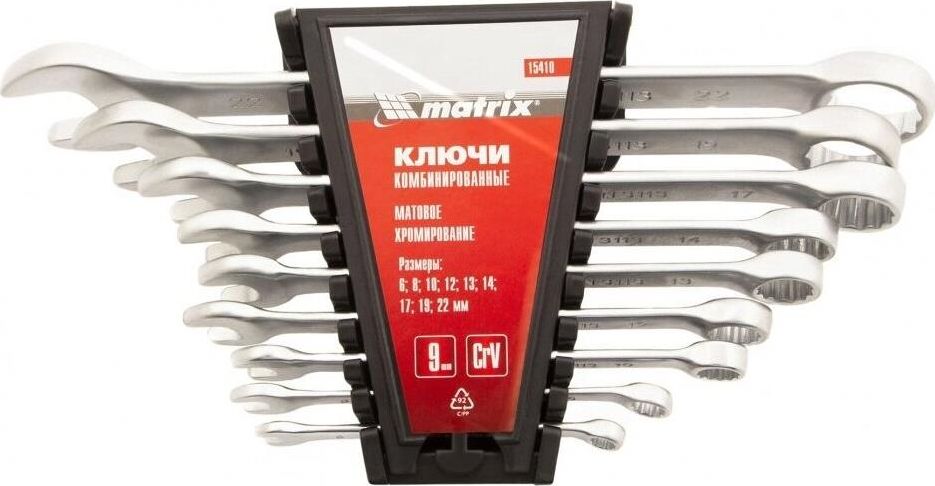 Набор Matrix 15410 включает 9 комбинированных ключей из стали CrV, размером 6-22 мм, с покрытием «матовый хром», которые пригодятся во время ремонтных работ дома или в гараже. С их помощью можно быстро монтировать и демонтировать крепежные элементы. В набор входят инструменты основных типоразмеров, позволяющие эффективно решать поставленные задачи.ПреимуществаВысокая деформационная стойкость — ключи изготовлены из хромованадиевой стали, а рабочие части закалены до твердости 45 HRC.Защита от разрушения — матовое хромоникелевое покрытие предотвращает образование коррозии.Аккуратная работа — накидные части с 12-гранным профилем охватывают всю поверхность крепежа, уменьшая риск деформации его граней.Комфортная работа в ограниченном пространстве — угол наклона кольцевых зевов относительно плоскости инструментов составляет 15°, что делает монтаж крепежа более удобным.Удобный пластиковый держатель — ключи не потеряются во время хранения и транспортировки.