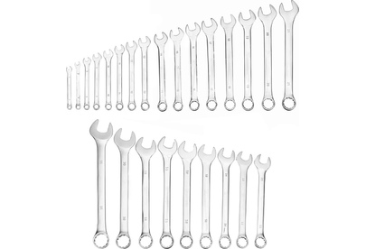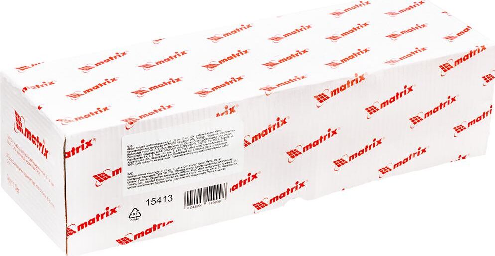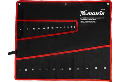 Набор Matrix 15413 включает 25 комбинированных ключей из стали CrV, размером 6-32 мм, с покрытием «матовый хром», которые пригодятся во время ремонтных работ дома или в гараже. С их помощью можно быстро монтировать и демонтировать крепежные элементы. В набор входят инструменты основных типоразмеров, позволяющие эффективно решать поставленные задачи.ПреимуществаВысокая деформационная стойкость — ключи изготовлены из хромованадиевой стали, а рабочие части закалены до твердости 48 HRC.Защита от разрушения — матовое хромоникелевое покрытие предотвращает образование коррозии.Аккуратная работа — накидные части с 12-гранным профилем охватывают всю поверхность крепежа, уменьшая риск деформации его граней.Комфортная работа в ограниченном пространстве — угол наклона кольцевых зевов относительно плоскости инструментов составляет 15°, что делает монтаж крепежа более удобным.Удобный чехол — ключи, размещенные в индивидуальных карманах, не потеряются во время хранения и транспортировки.