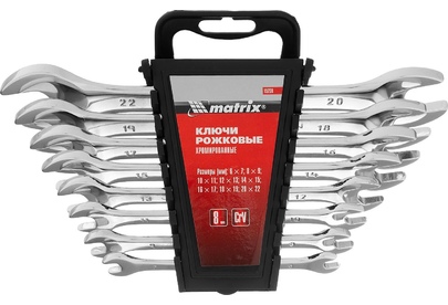 Набор Matrix Elliptical 15238 включает в себя 8 рожковых ключей из стали CrV с зеркальным хромированием и предназначен для закручивания и откручивания резьбовых соединений с шестигранным профилем и размером головки от 6 до 22 мм. Ключи удобны для манипуляций в ограниченном пространстве, т. к. у каждого из них губки расположены под углом к рукоятке. Набор будет полезен при проведении монтажных, сантехнических работ, для ремонта автомобилей или бытовой техники, также пригодится в быту. Преимущества Высокий показатель прочности и надежности — ключи изготовлены из хромованадиевой стали. Износостойкость — твердость рабочих частей составляет 45 HRC, что полностью соответствует требованиям ГОСТа (45-51 HRC). Защита от разрушения — зеркальное хромоникелевое покрытие предотвращает образование коррозии. Удобное хранение и транспортировка — в комплект поставки входит трапециевидный пластиковый держатель.