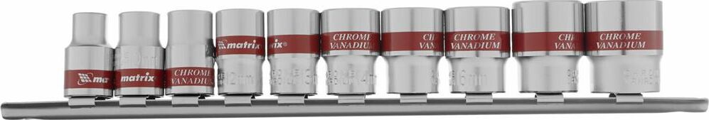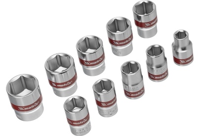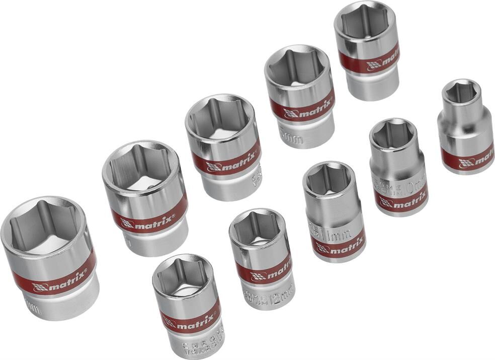 Набор торцевых головок Matrix 13558 из стали CrV, с посадочным гнездом 3/8"" и шестигранным профилем, включает 10 насадок диаметром 8-19 мм, предназначенных для работы с резьбовыми соединениями. Пригодится для проведения бытового ремонта, будет полезен сантехнику, слесарю, авторемонтнику.ПреимуществаУниверсальность — в комплект входят насадки самых распространенных размеров.Прочность — торцевые головки из хромованадиевой стали выдерживают повышенные нагрузки.Коррозионная стойкость — на головки нанесено полированное хромоникелевое покрытие.Быстрый поиск нужной насадки — каждая торцевая головка маркирована ярко-красной полоской и имеет обозначение типоразмера.Удобное хранение — для головок предусмотрена плашка-держатель, поэтому они всегда будут под рукой и не потеряются.