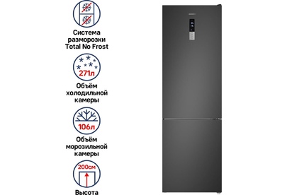 Количество камер: двухкамерный. Расположение морозильной камеры: снизу. Тип управления: сенсорное. Класс энергопотребления: A+. Система размораживания: No Frost. Общий объем холодильника: 377. Общий объем холодильной камеры: 271. Общий объем морозильной камеры: 106. Уровень шума: 42. Количество компрессоров: один. Мощность замораживания: 4.5. Количество полок: 4. Количество ящиков: 3. Материал полок: стекло. Зона свежести: есть. Антибактериальное покрытие: есть. Система размораживания: No Frost. Тип: Холодильник. Полезный объем холодильника: 351. Хладагент: R600a. Количество ящиков: 2. Вес (нетто): 67. Количество дверей: 2. Габариты упаковки (ед) ДхШхВ: 0.7x0.63x2.04. Вес упаковки (ед): 105. Страна производства: Китай. Количество полок на дверце: 6. Материал дверей: металл. Наличие морозильной камеры: есть. Технология автоматического размораживания морозильной камеры: Total No Frost. Технология автоматического размораживания холодильной камеры: Total No Frost. Технология многопоточного охлаждения: Multi Air F