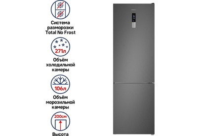 Количество камер: двухкамерный. Расположение морозильной камеры: снизу. Тип управления: сенсорное. Класс энергопотребления: A+. Система размораживания: No Frost. Общий объем холодильника: 377. Общий объем холодильной камеры: 271. Общий объем морозильной камеры: 106. Уровень шума: 42. Количество компрессоров: один. Мощность замораживания: 4.5. Количество полок: 4. Количество ящиков: 3. Материал полок: стекло. Зона свежести: есть. Антибактериальное покрытие: есть. Система размораживания: No Frost. Тип: Холодильник. Полезный объем холодильника: 351. Хладагент: R600a. Количество ящиков: 2. Вес (нетто): 67. Количество дверей: 2. Габариты упаковки (ед) ДхШхВ: 0.7x0.63x2.05. Вес упаковки (ед): 105. Страна производства: Китай. Количество полок на дверце: 6. Материал дверей: металл. Наличие морозильной камеры: есть. Технология автоматического размораживания морозильной камеры: Total No Frost. Технология автоматического размораживания холодильной камеры: Total No Frost. Технология многопоточного охлаждения: Multi Air F
