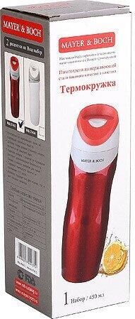 Термос-кружка «MAYER & BOCH» изготовлена из нержавеющей стали, не содержащей токсичных веществ. Двойные стенки дольше сохраняют напиток горячим и не обжигают руки. Надежная крышка с защитой от проливания обеспечит дополнительную безопасность. Крышка оснащена клапаном для питья. Основание имеет силикованную вставку для предотвращения скольжения по поверхности. Оптимальный объем термокружки позволит взять с собой большую порцию горячего кофе или чая. Идеально подходит как для горячих, так и для холодных напитков. Такая кружка может быть использована во время отдыха, на работе, в путешествии, во время поездок в автомобиле.