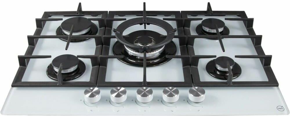 Тип панели: газовая. Установка рабочей поверхности: независимая. Материал поверхности: закаленное стекло. Материал решетки: чугун. Заводская настройка на газ: 20. Суммарная мощность газовых конфорок: 11.6. Цвет: стекло белое. Конфорка ВОК: есть. Вес (нетто): 20.42. Газ-контроль: есть. Габариты упаковки (ед) ДхШхВ: 0.78x0.59x0.151. Вес упаковки (ед): 21.27. Страна производства: Турция. Настроенный вид газа: природный (метан). Общее количество конфорок: 5. Расположение панели управления: спереди. Управление: механическое. Электроподжиг: в ручке (автоматический). Гарантия: 36 мес.. Левая ближняя конфорка: газовая, мощность 1.6 кВт, одноконтурная. Левая дальняя конфорка: газовая, мощность 1.6 кВт, одноконтурная. Средняя конфорка: газовая, мощность 4.8 кВт, двухконтурная. Размеры (ШхГхВ): 710х510х60 мм. Размеры ниши для встраивания (ШхГхВ): 560х485. Правая ближняя конфорка: газовая, мощность 1 кВт, одноконтурная. Правая дальняя конфорка: газовая, мощность 2.6 кВт, одноконтурная. Тип переключателей: поворотные. Осо