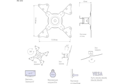 Тип кронштейна Наклонно-поворотный. Крепежные отверстия (VESA) 75x75, 100x100, 100x200, 200x100, 200x200. Мин. диагональ экрана (дюймы) 15. Макс. Диагональ экрана (дюймы) 45. Максимальная нагрузка, (кг.) 30. Угол наклона (°) 15. Угол повотора (°) 60. Вращение экрана (°) 360. Расстояние от стены (мм.) 65. Цвет кронштейна белый. Гарантия (лет) 2.