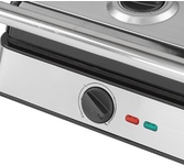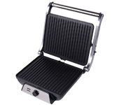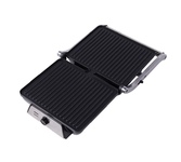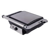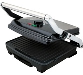 Гриль электрический, мощность 2000 Вт, регулируемый термостат (максимальная температура 240°С), 2 рифленые панели для жарки, размер панели 29,7х23,6 см, антипригарное покрытие, открытие панелей на 180° (возможность приготовления на 2 пластинах одновременно), индикатор работы, прорезиненные ножки. Корпус из нержавеющей стали и термостойкого пластика. Комплектация: резервуар для сбора масла.
