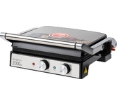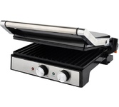 3 в 1: гриль, духовка, барбекю; мощность: 2200 Вт, тип управления: механическое, нагревательный элемент: нержавеющая сталь, регулировка температуры каждой панели, диапазон температур нагрева: 40-235 °С, материал корпуса: металл, бакелит, материал панелей: металл, антипригарное Non-Stick PRO, размер рабочей поверхности: 290 x 240 мм, количество панелей: 2, регулировка высоты, максимальный угол открытия крышки: 180°, индикатор нагрева. индикатор питания, съемный поддон для сбора масла/жира, длина шнура: 0.7 м, напряжение: 220-240 В, 50-60 Гц, защита от поражения электротоком: класс I