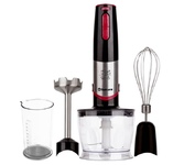 мощный и тихий DC мотор, 2 скорости работы — дополнительная регулировка, острые лезвия из нержавеющей стали, погружная часть блендера из нержавеющей стали, венчик из нержавеющей стали; 3 насадки (блендер, венчик, чоппер 0,5 л), стакан (0,5 л)