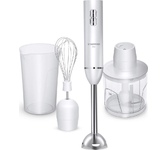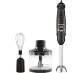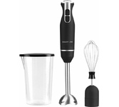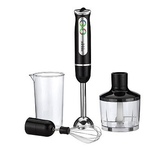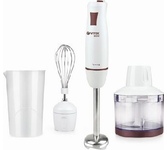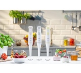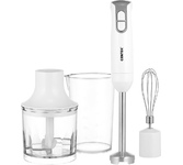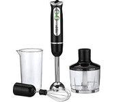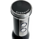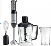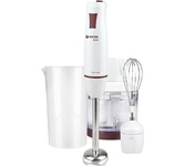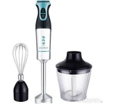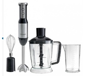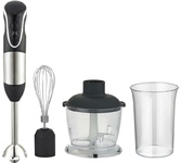 Погружной блендер, мощность 750W, современный эргономичный дизайн, пульсовый режим работы, 2 скорости, режим "Турбо", лезвия из нержавеющей стали, металлическая нога блендера, венчик для взбивания, чаша с ножом для рубки и измельчения, 400 мл; автоматичес