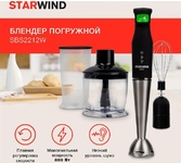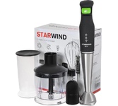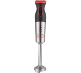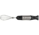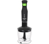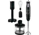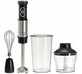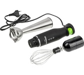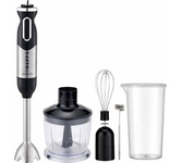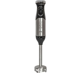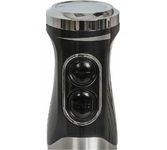 Блендер погружной, набор, максимальная мощность 1000 ватт, 2 скорости включая режим ТУРБО, бесступенчая регулировка скорости - до 6 скоростых режимов, погружная часть блендера из нержавеющей стали, измельчитель 500 мл, мерный стакан 700 мл, венчик для взбивания, цвет корпуса черный с металлической вставкой