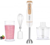 Тип: погружной Мощность: 1200 Вт Материал погружной части: нержавеющая сталь Скоростей/режимов: 5, плавная регулировка скорости Насадки: измельчитель, венчик для взбивания Чаша: 0.5 л, пластик Режимы: турборежим