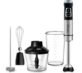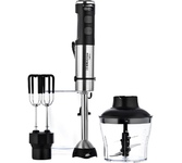 Мощность 1300 Вт, Лезвия из нержавеющей стали, Стакан 600 мл, Чоппер 500 мл, 5 скоростей + режим TURBO, Съемная насадка и венчик, Защита от разбрызгивания, Петелька для подвешивания , Плавный регулятор мощности, Легкость и простота в обращении.
