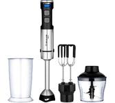 Мощность 1500 Вт Объем 0.65 л, 0.8 л Кол-во скоростей 15 Режимы Турбо Материал корпуса Пластик, Сталь Особенности LED-подсветка, Плавный регулятор мощности, Специальная заточка лезвий Комплект аксессуаров Мерный стакан (800 мл), Насадка для пюре, Насадка-капучинатор, Насадки для взбивания, Насадки для замешивания, Чоппер (650 мл) Тип конструкции Погружной Гарантия 1 год